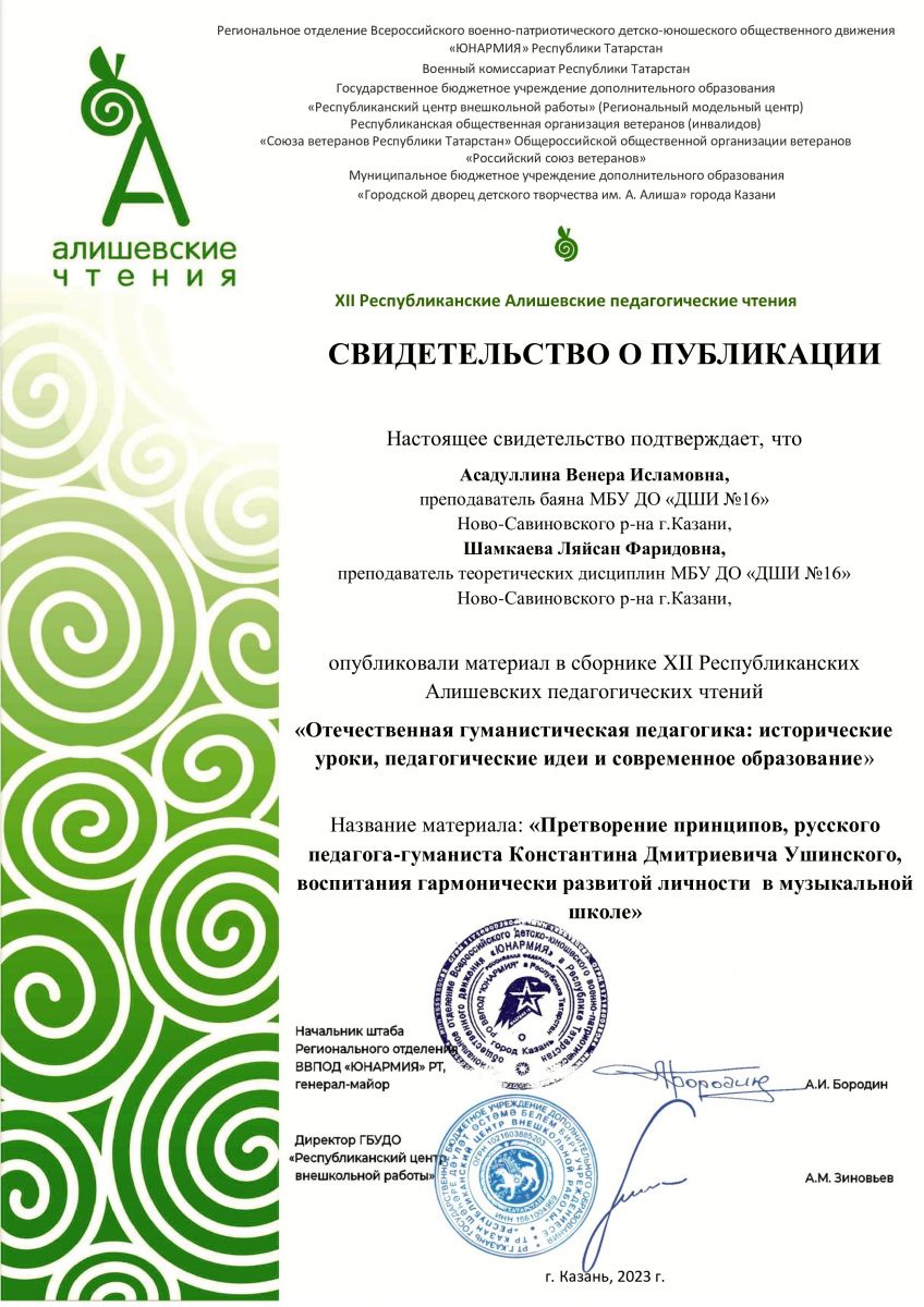 Асадуллина В.И. , Шамкаева Л.Ф. - Свидетельство о публикации " Алишевские педагогические чтения"