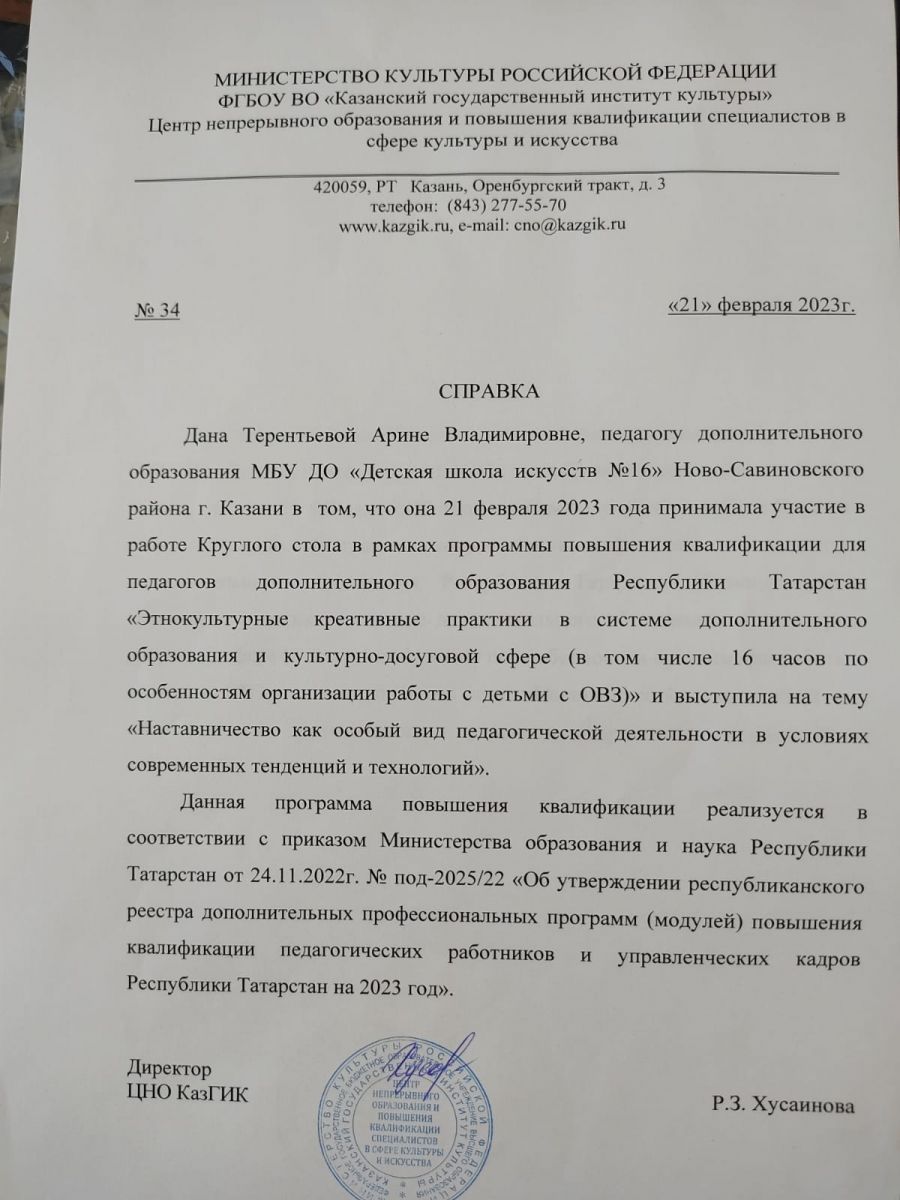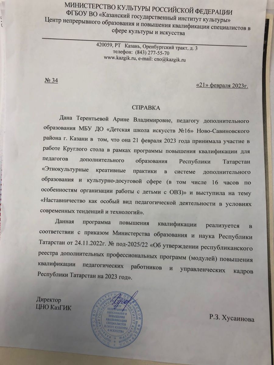 Терентьева А.В. - справка об участии в Круглом столе в рамках программы повышения квалификации