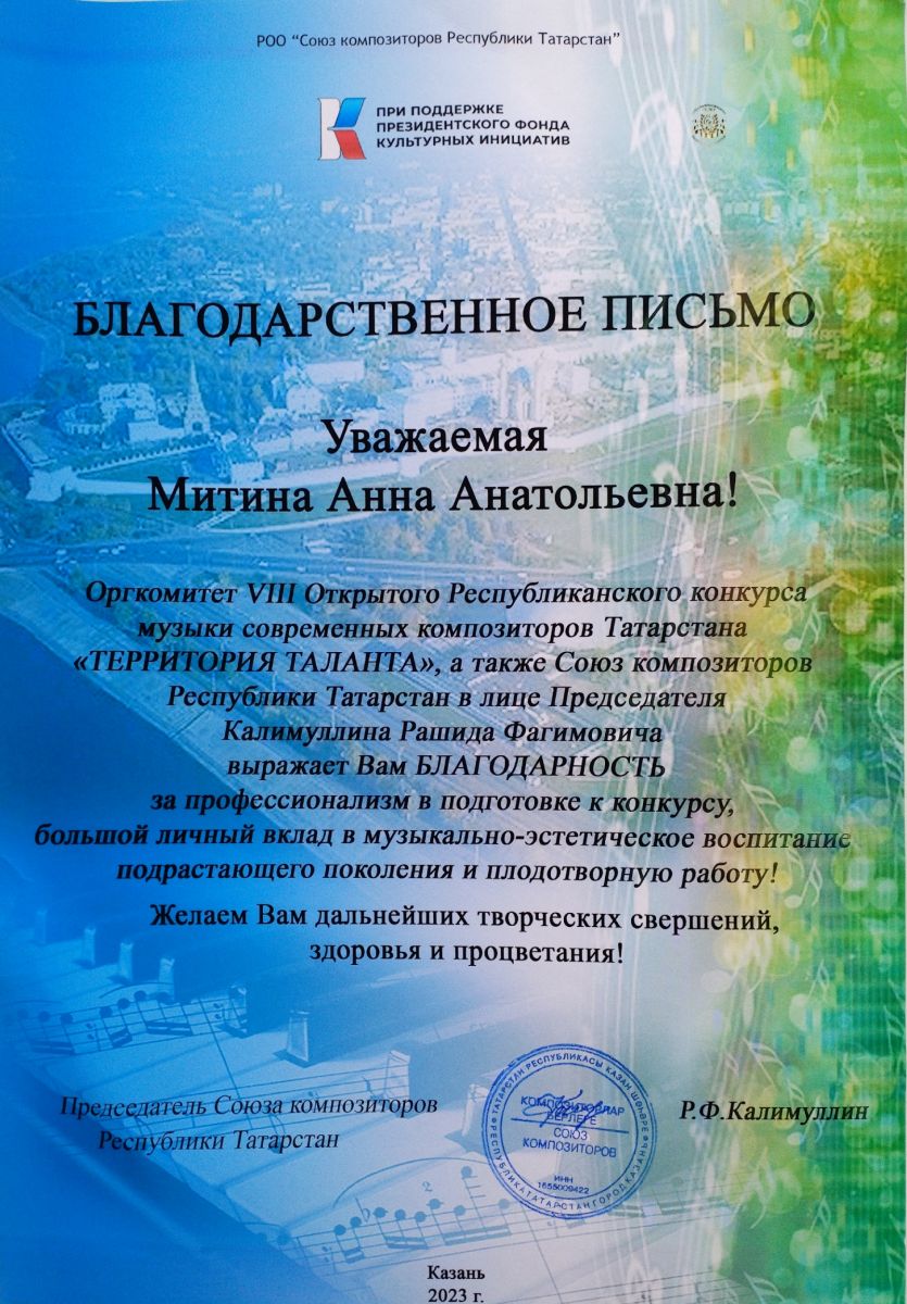 Митина А.А, - Благодарственное письмо конкурса-фестиваля "Территория таланта".jpg