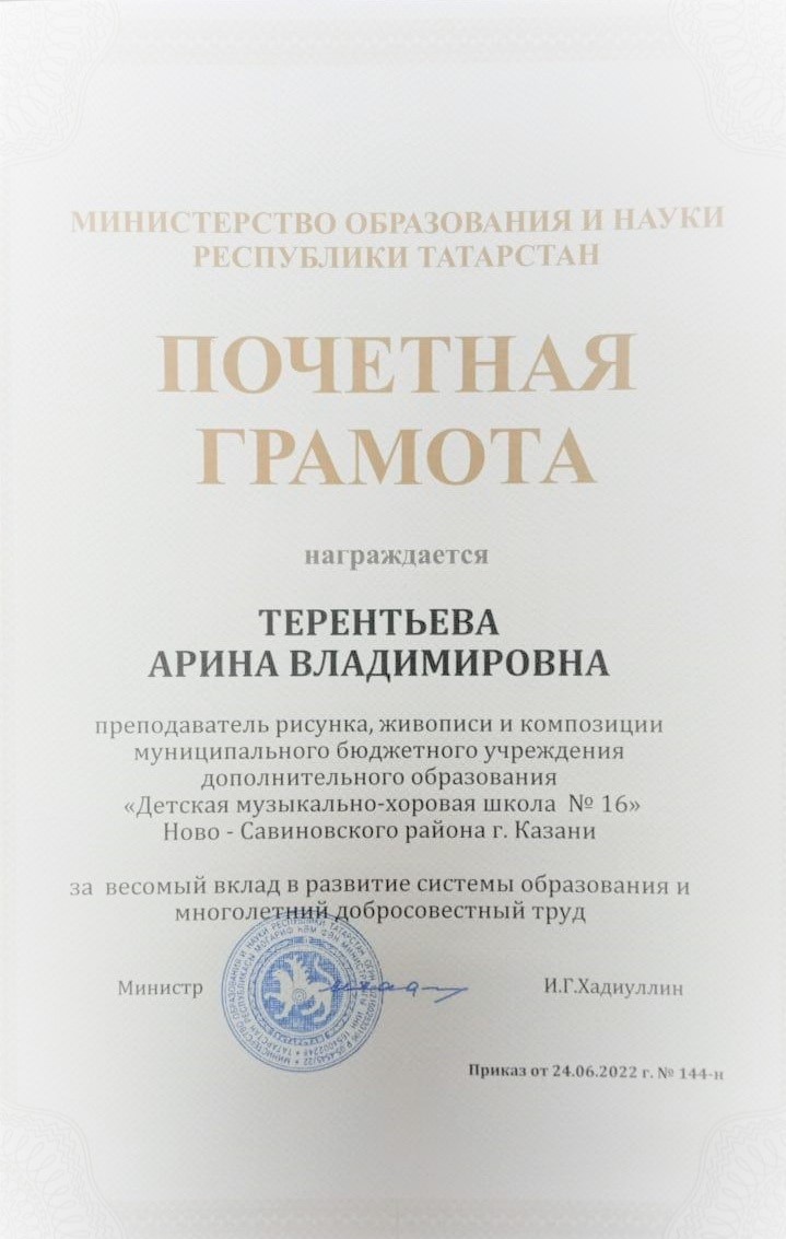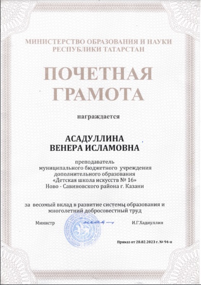Асадуллина В.И. - Почетная грамота за весомый вклад от Министерства образования и науки РТ