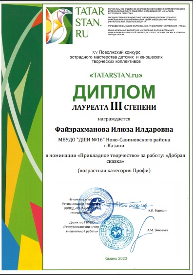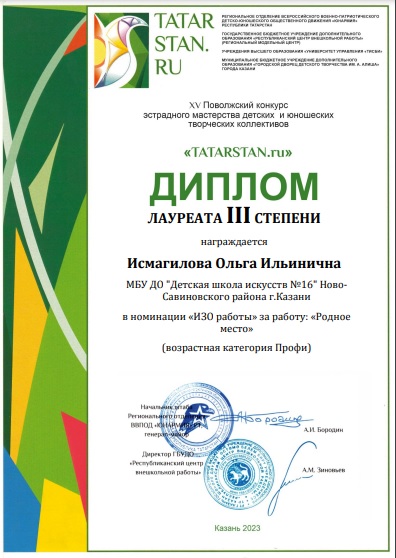 Исмагилова О.И. - лауреат 3 степени - Поволжский конкурс "Tatarstan.ru"