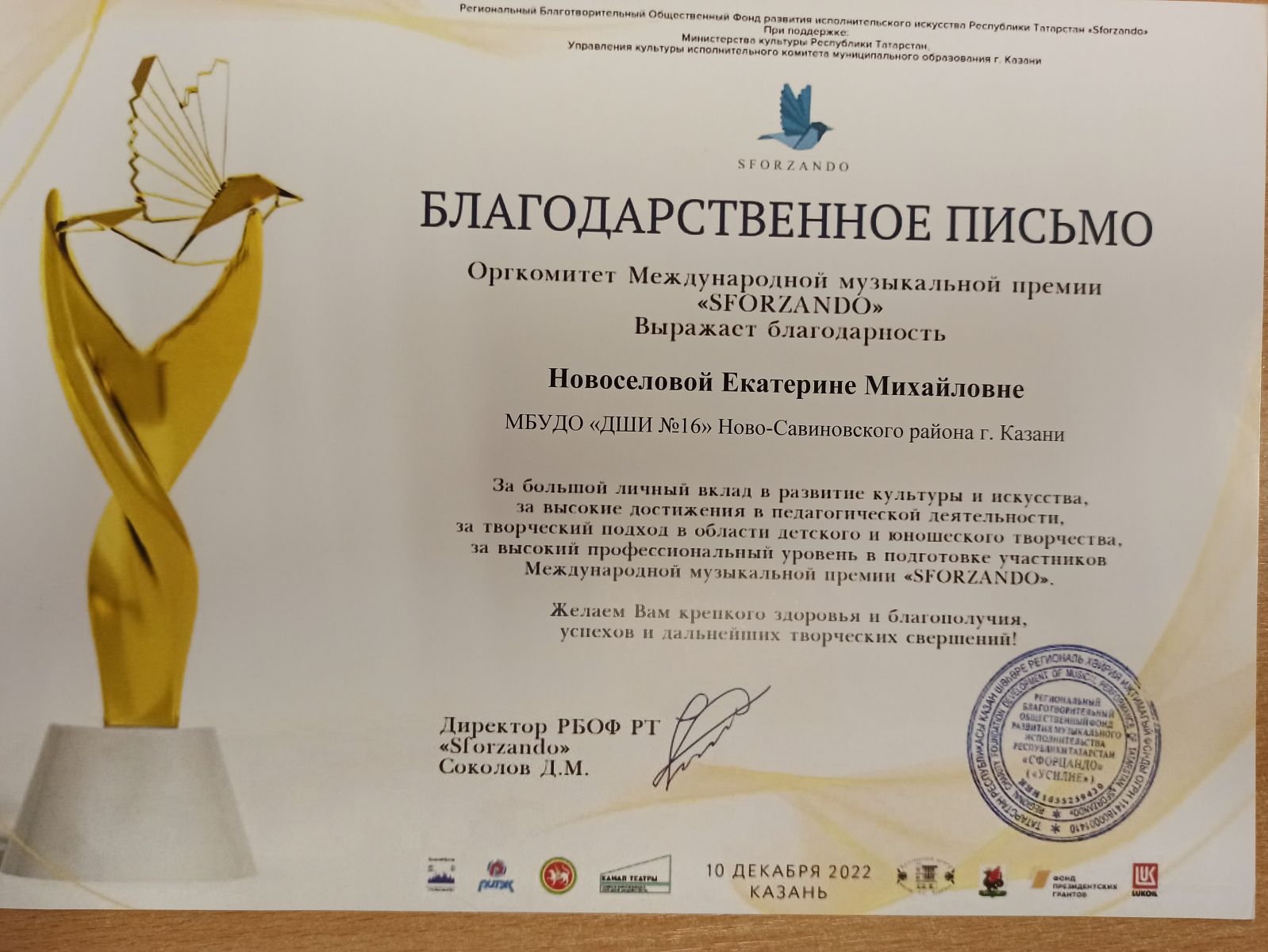 Новоселова Е.М. - Благодарственное письмо Музыкальной премии "Сфорцандо"