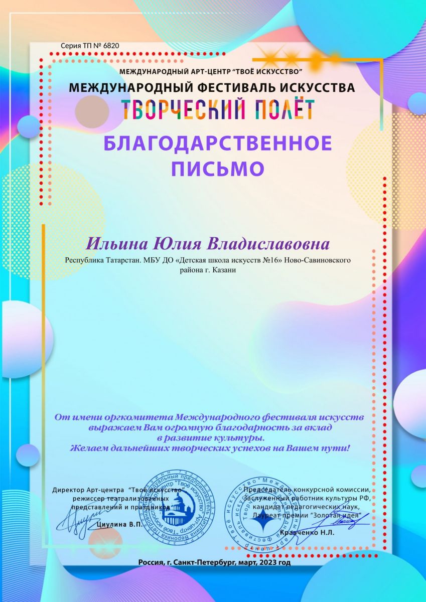 Ильина Ю.В. - Благодарственное письмо "Творческий полет"