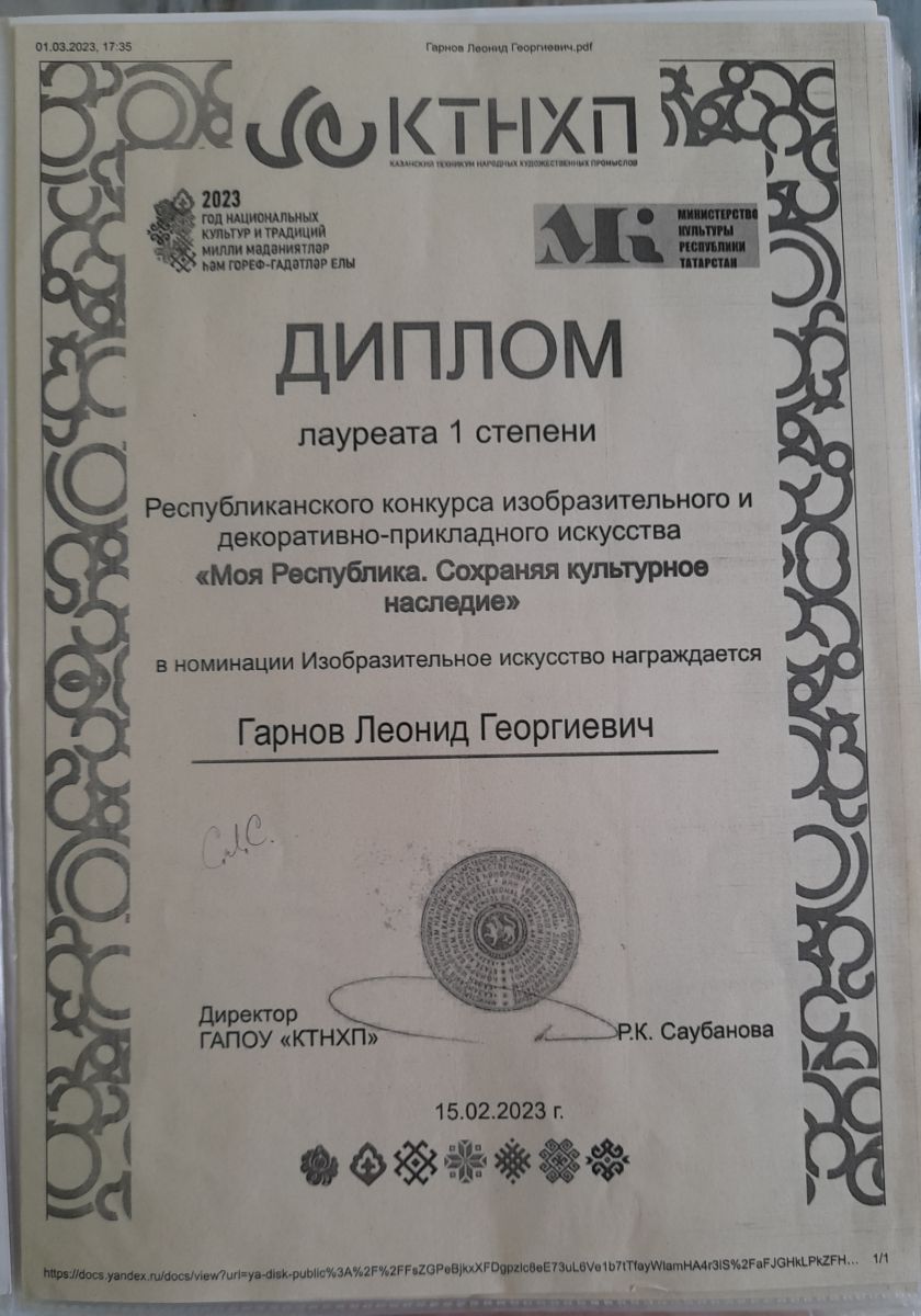 Гарнов Леонид - лауреат 1 степени "Моя республика. Сохраняя культурное наследие"