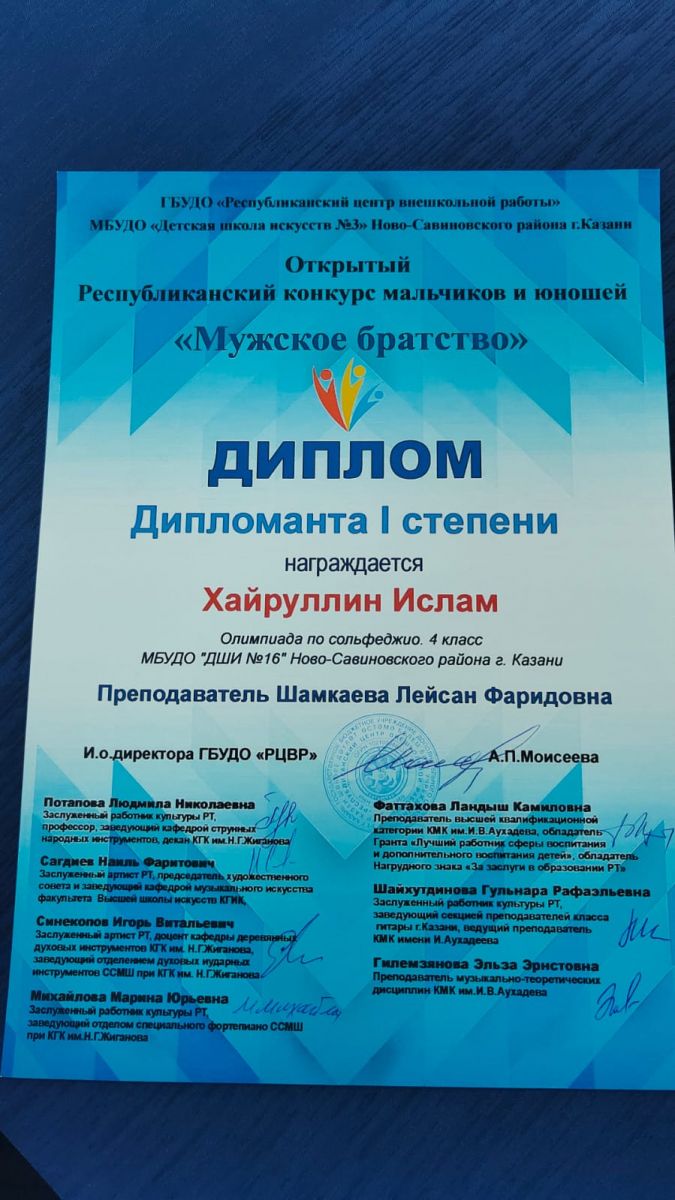 Хайруллин Ислам - дипломант 1 степени Олимпиада "Мужское братство"