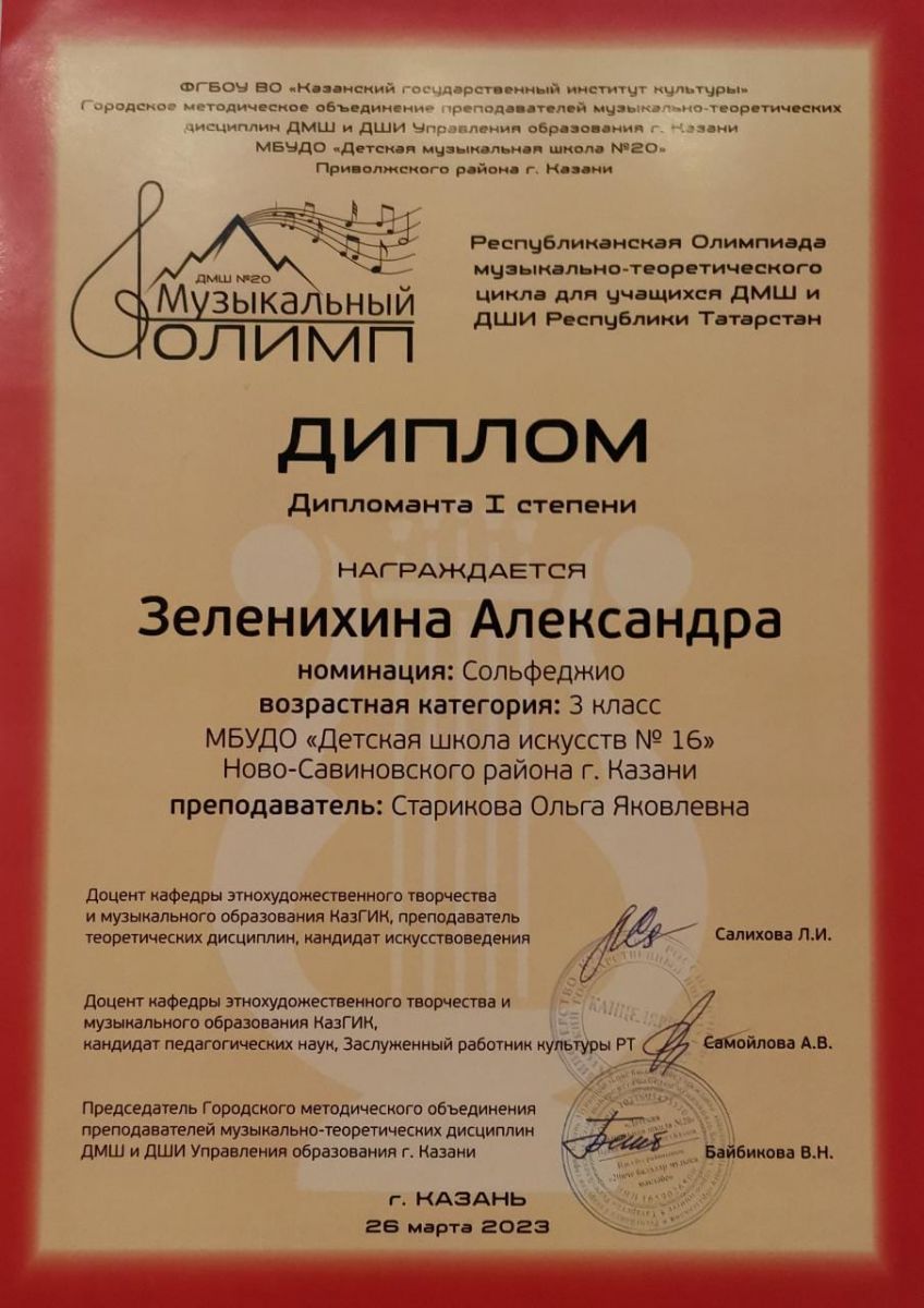 Зеленихина Александра - дипломант 1 степени "Музыкальный Олимп"