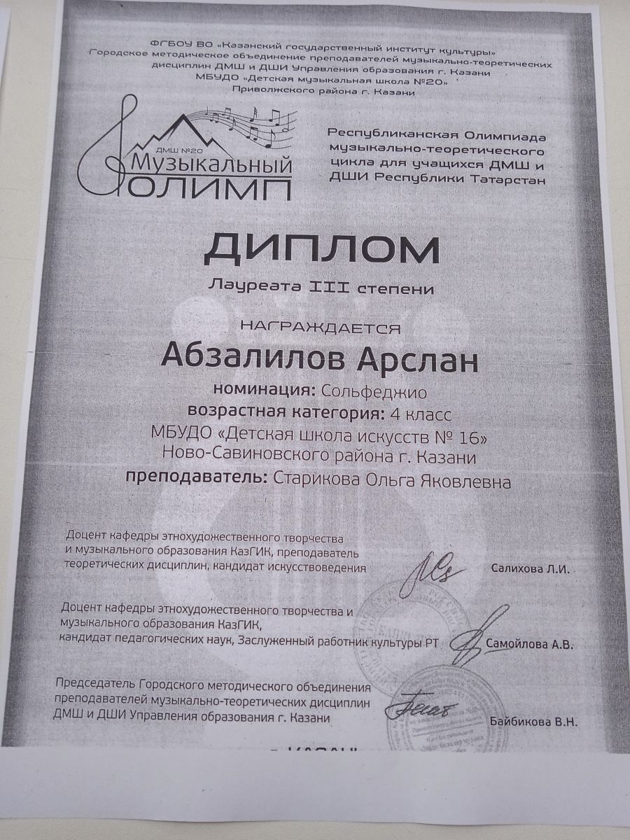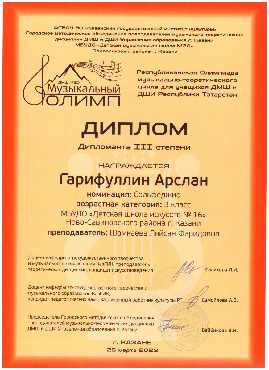 Гарифуллин Арслан - дипломант III степени "Музыкальный Олимп"