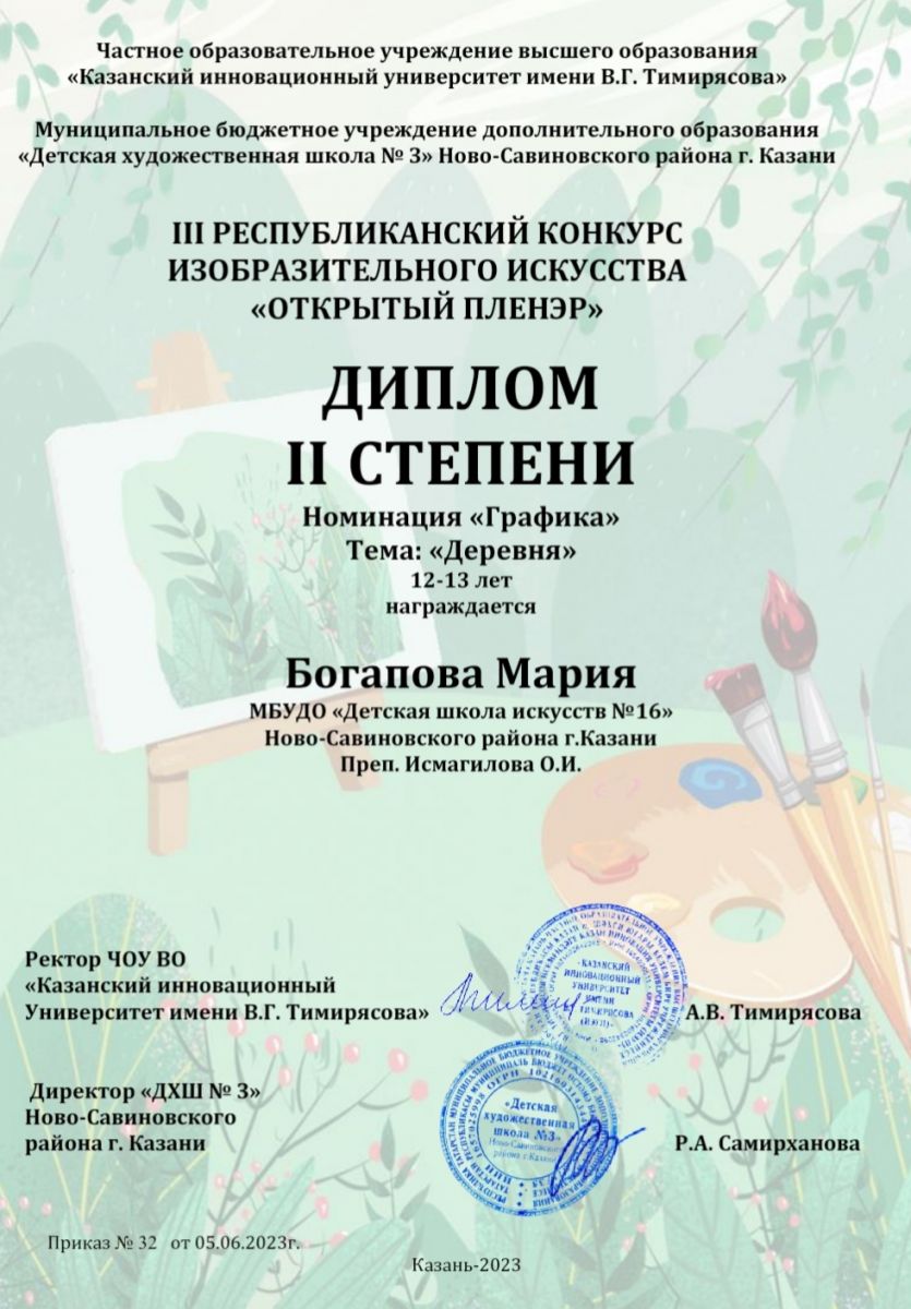 Богапова Мария - диплом 2 степени "Открытый пленэр"