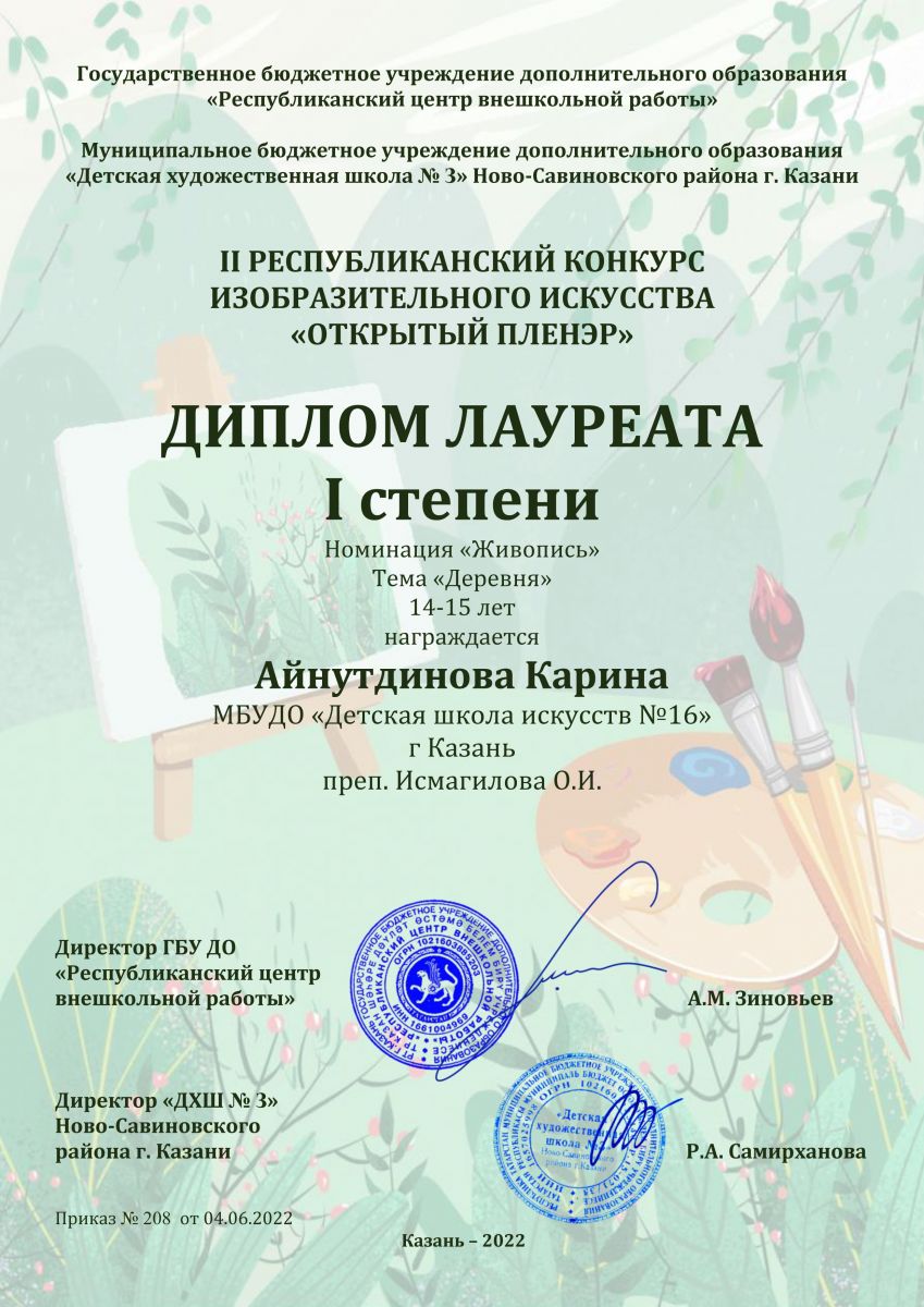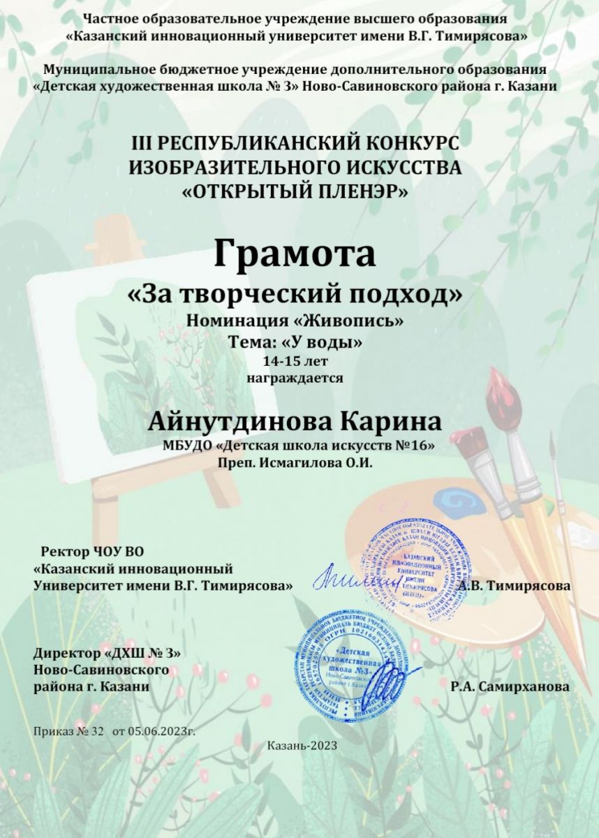Айнутдинова Карина - грамота за творческий подход "Открытый пленэр"