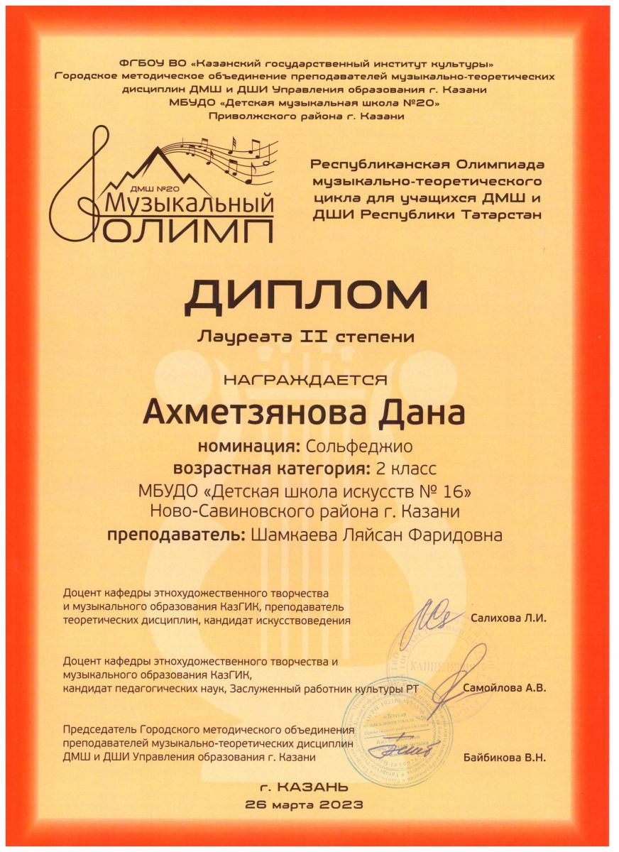 Ахметзянова Дана - лауреат II степени "Музыкальный Олимп"