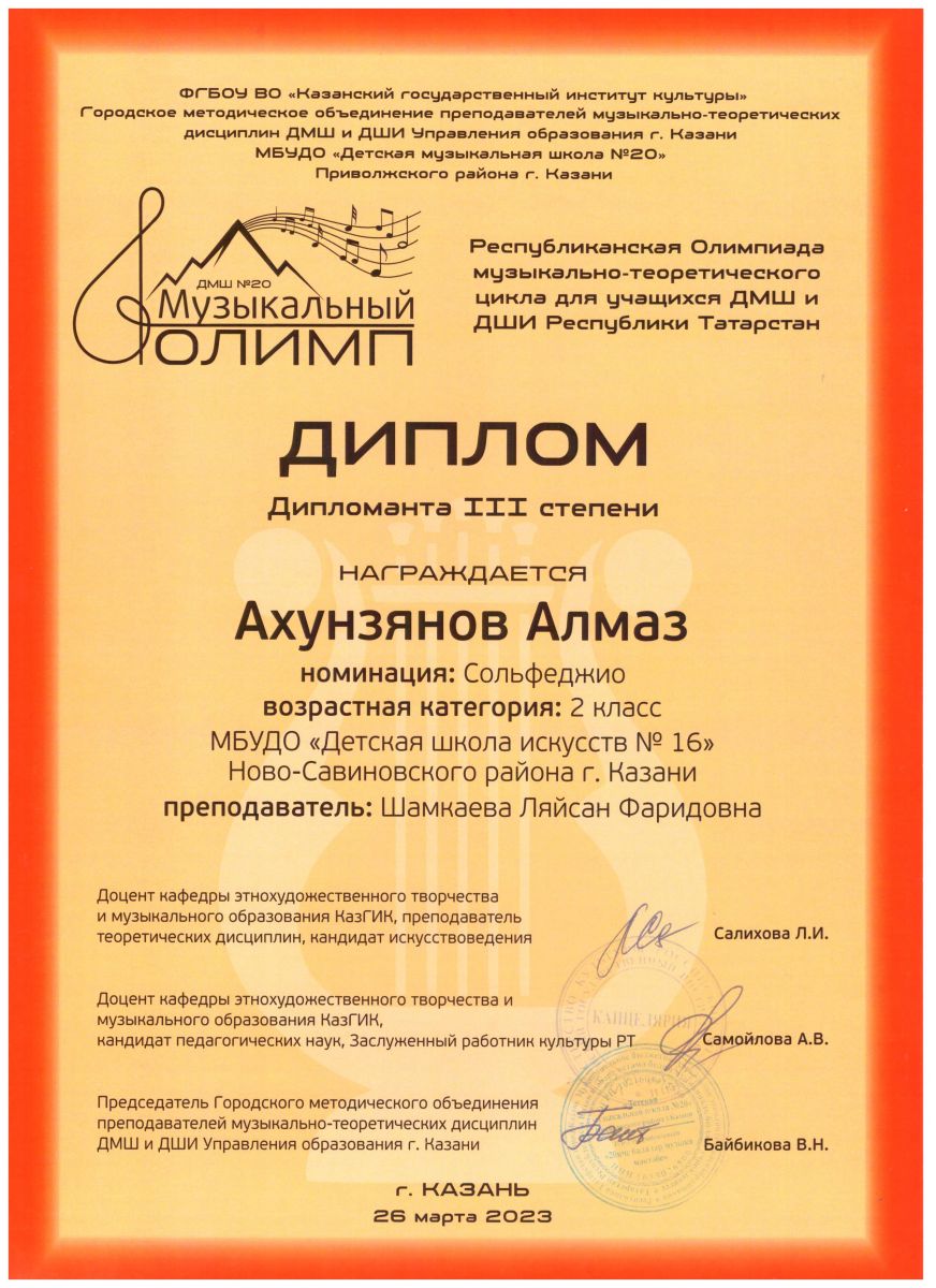 Ахунзянов Алмаз - дипломант III степени "Музыкальный Олимп"