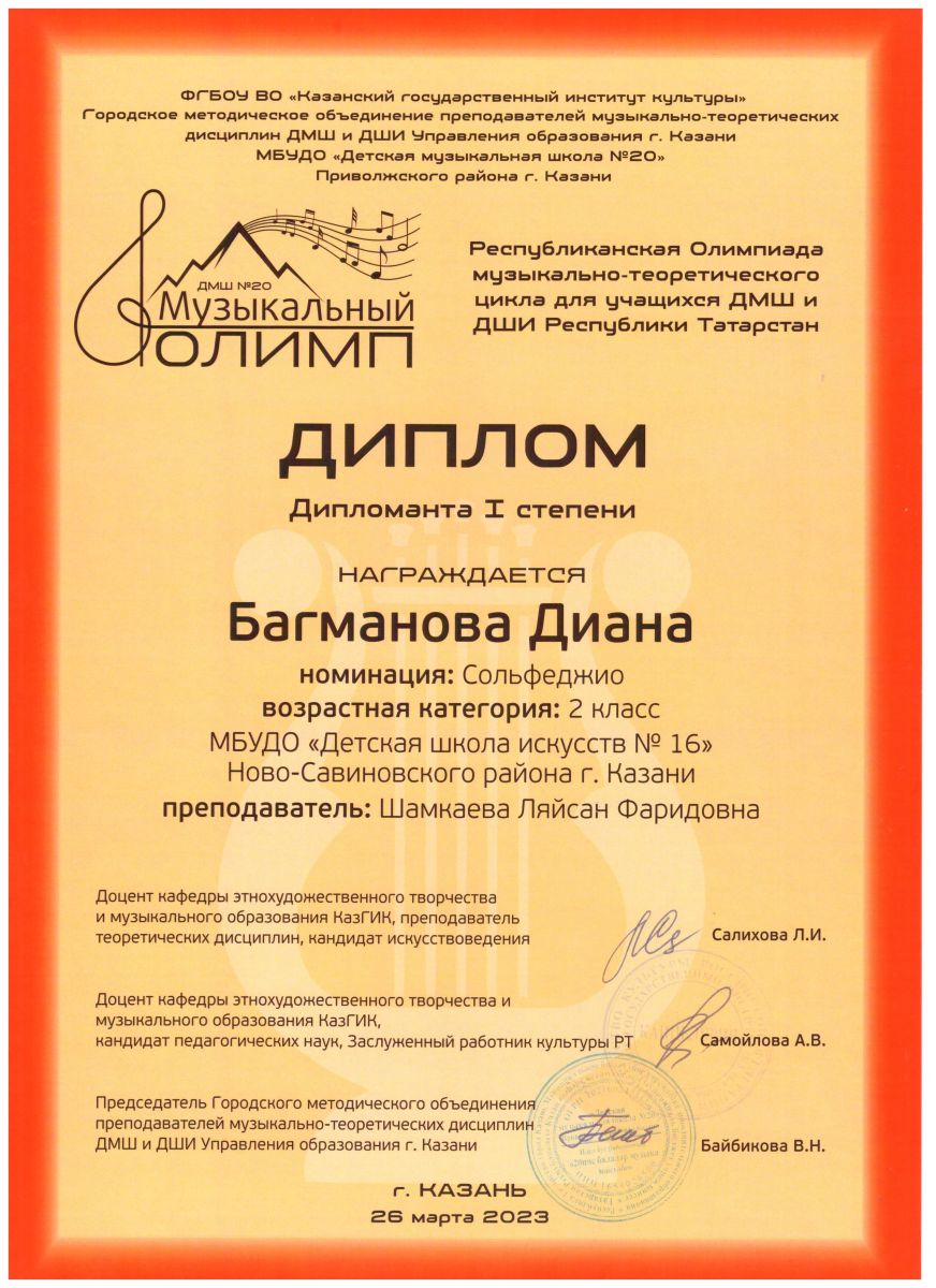 Багманова Лиана - дипломант I степени "Музыкальный Олимп"