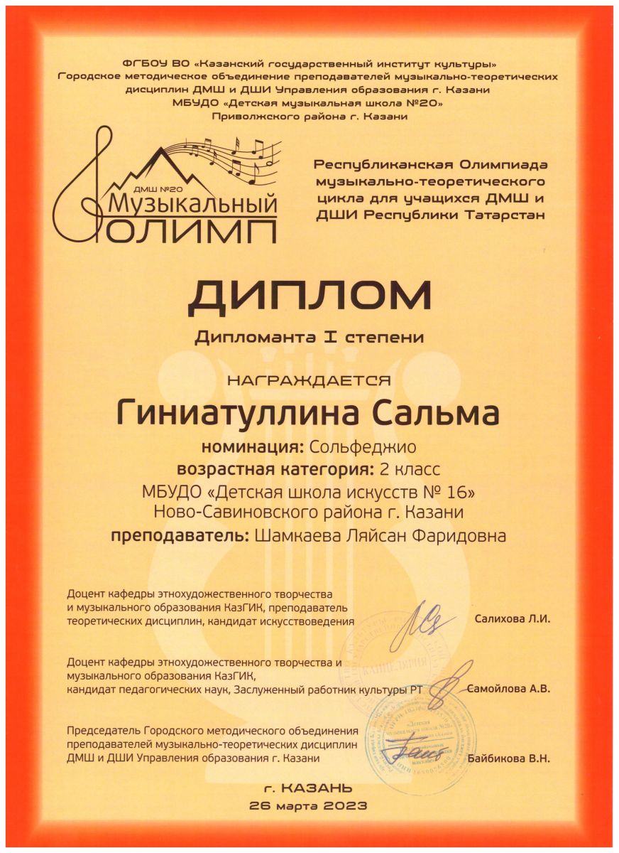 Гиниатуллина Сальма - дипломант I степени "Музыкальный Олимп"