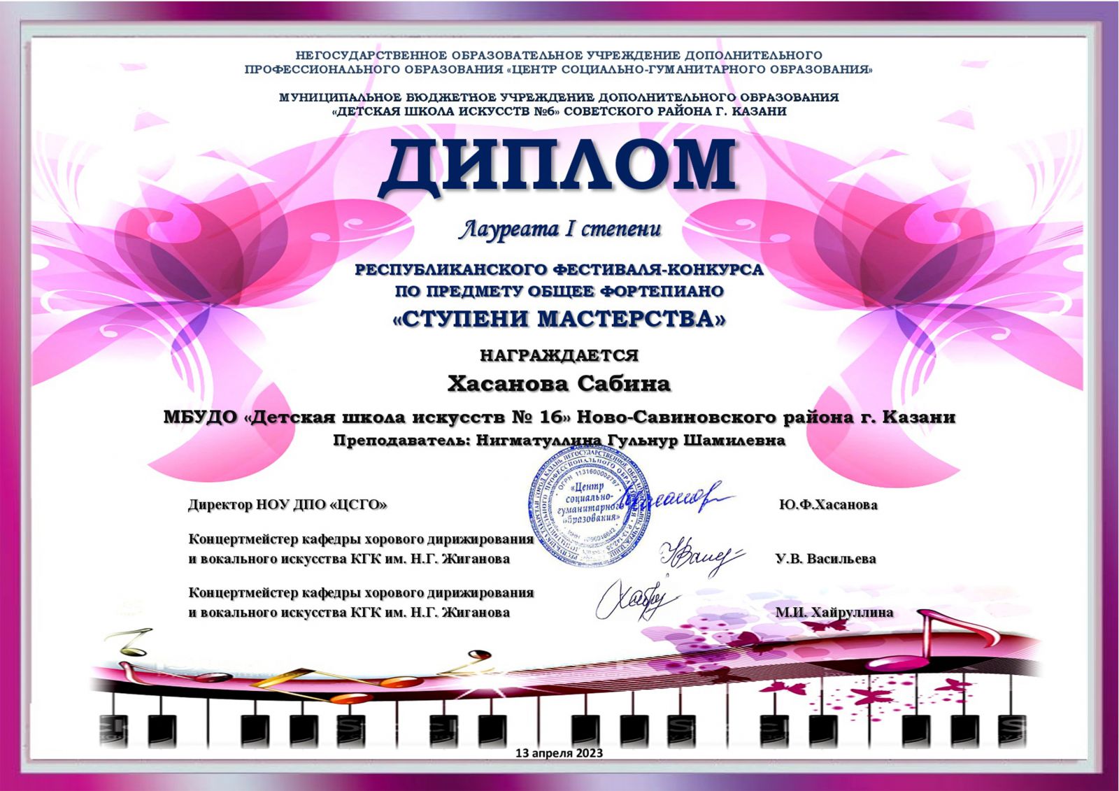 Хасанова Сабина - лауреат 1 степени "Ступени мастерства"