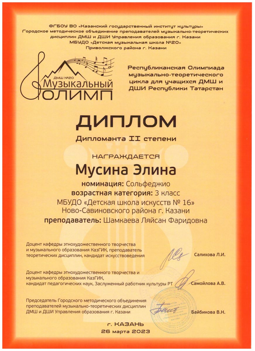Мусина Элина - дипломант II степени "Музыкальный Олимп"
