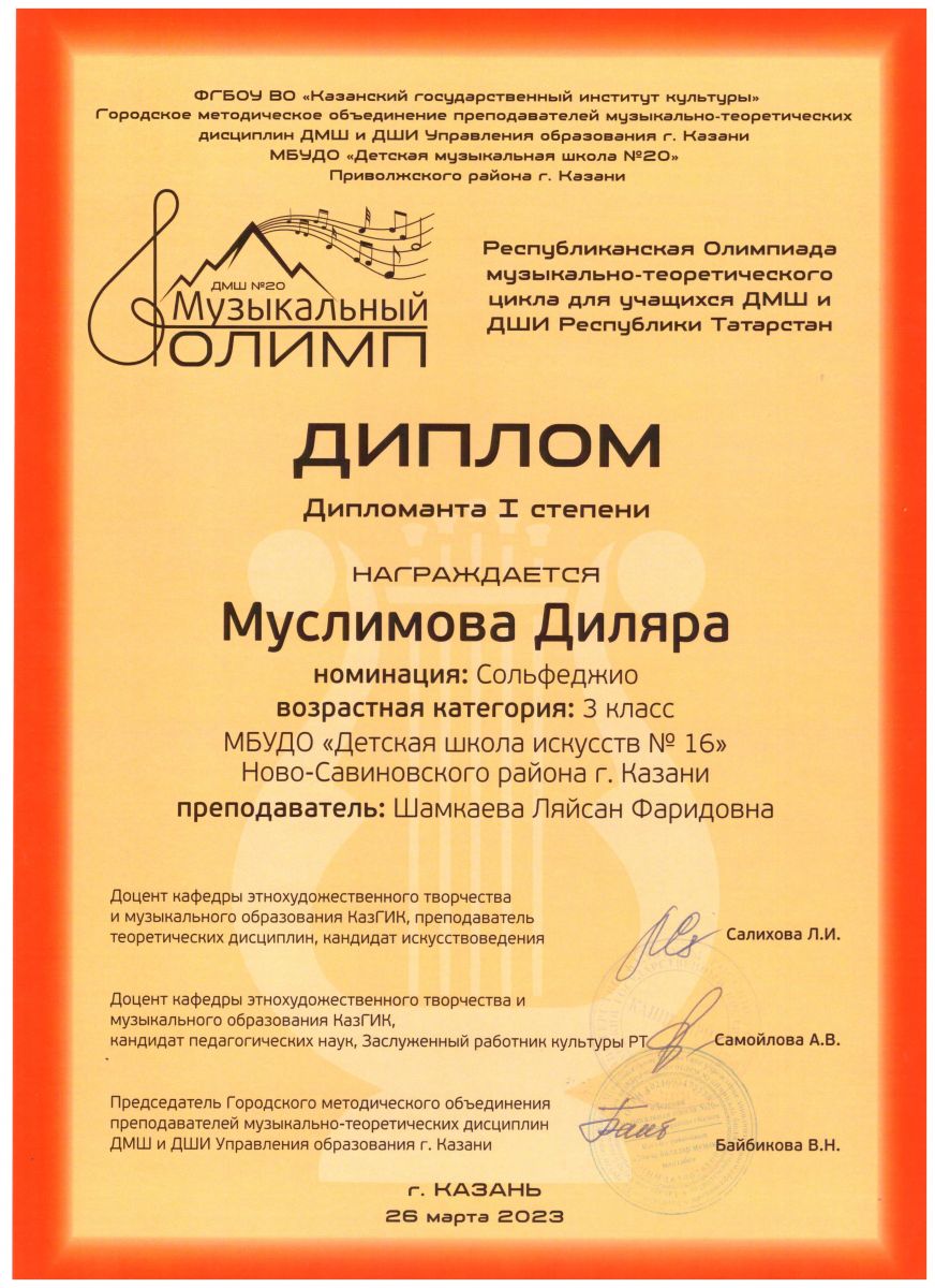 Муслимова Диляра - дипломант I степени "Музыкальный Олимп"