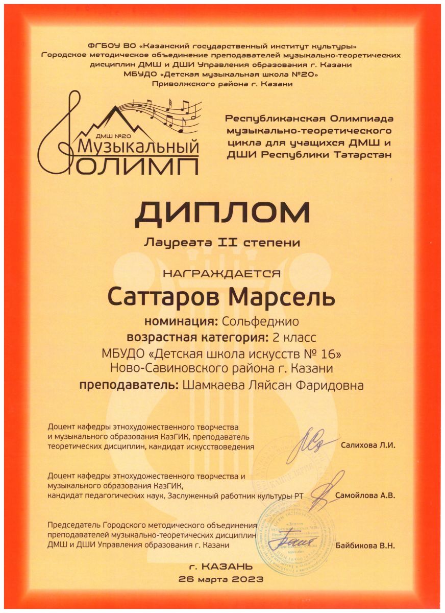 Саттаров Марсель - лауреат II степени "Музыкальный Олимп"