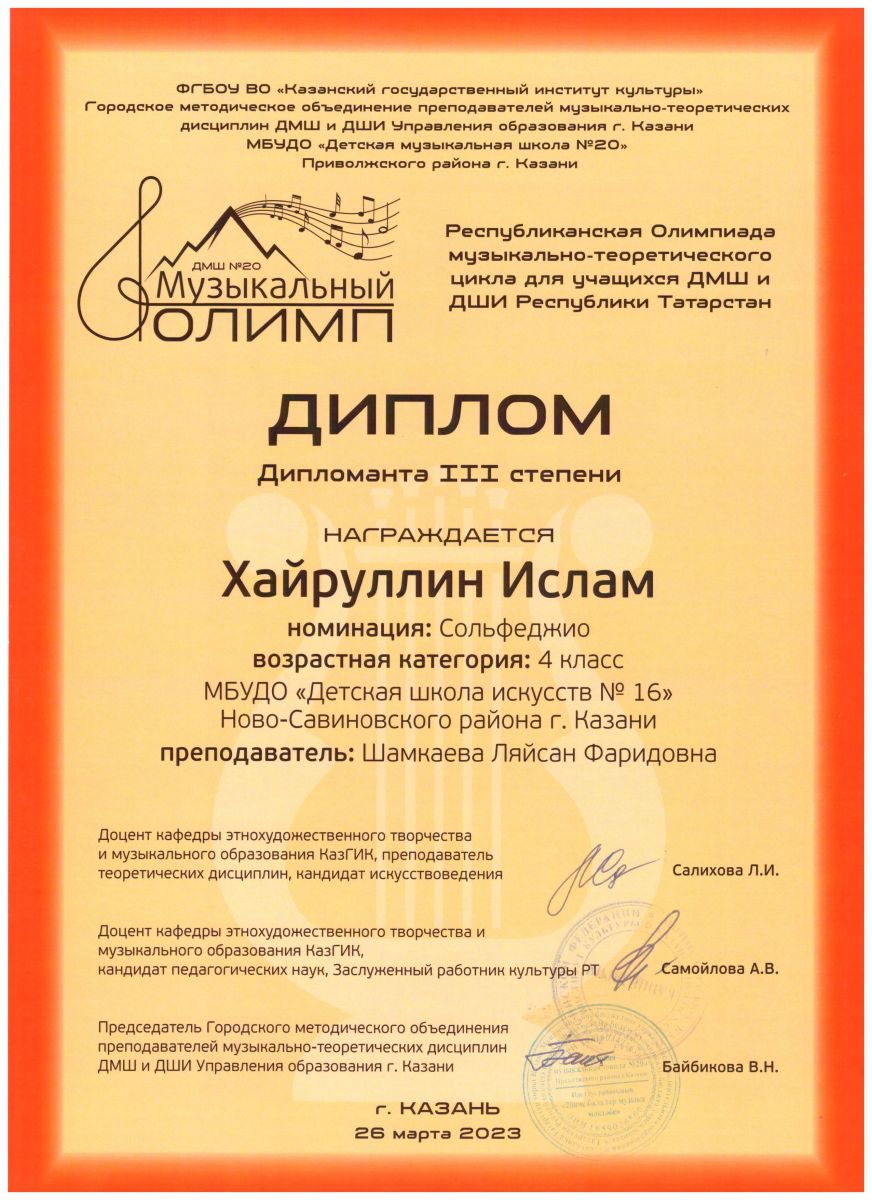 Хайруллин Ислам - дипломант III степени "Музыкальный Олимп"