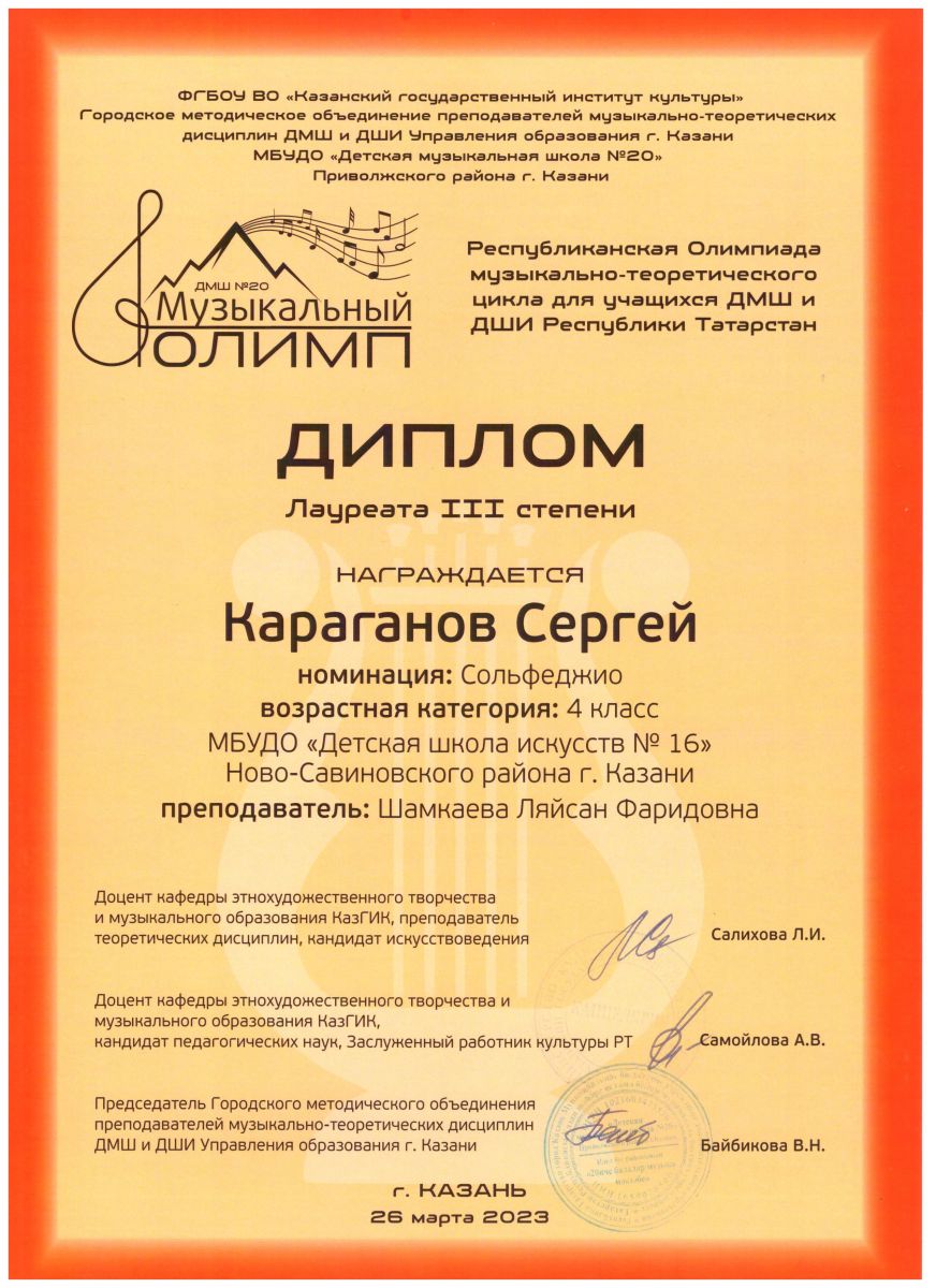 Караганов Сергей - лауреат III степени "Музыкальный Олимп"