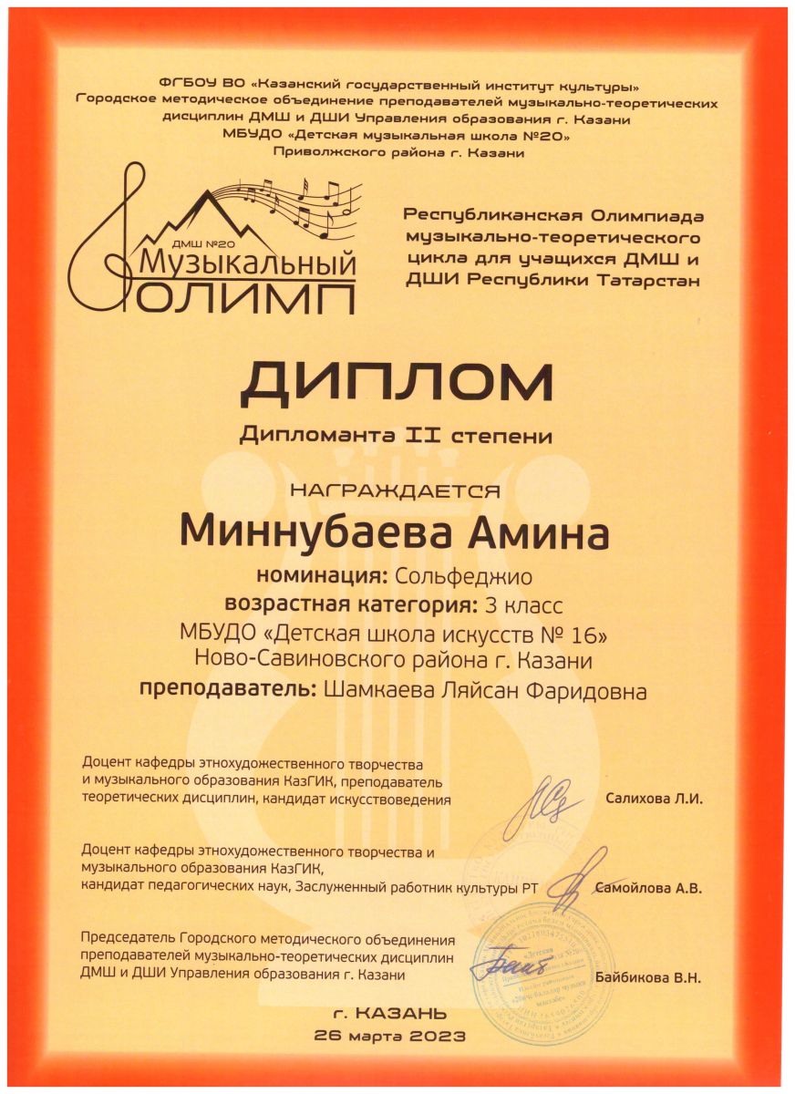 Миннубаева Амина - дипломант II степени "Музыкальный Олимп"