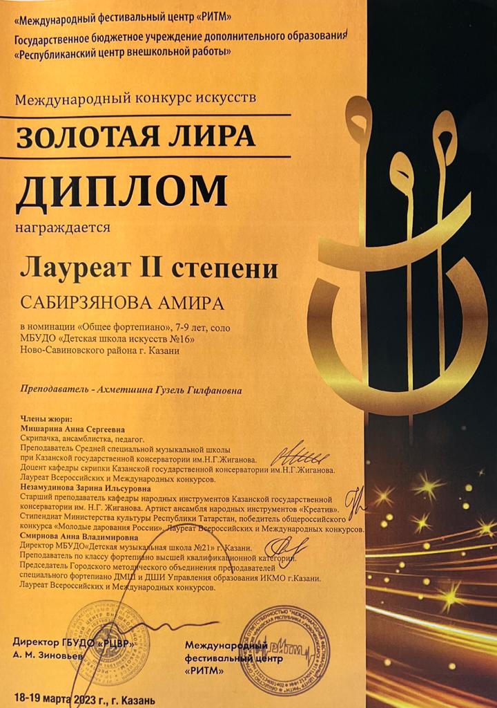 Сабирзянова Амира - лауреат 2 степени "Золотая лира"