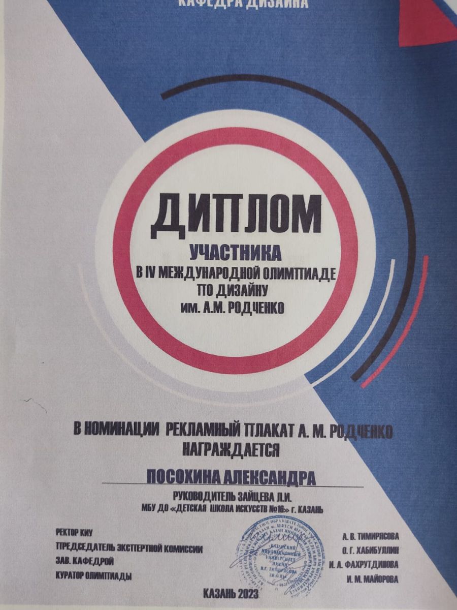 Посохина Александра - диплом участника IV Международной Олимпиады им.Родченко