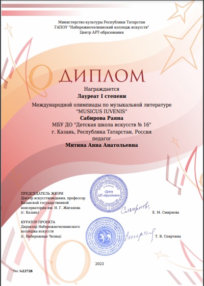 Сабирова Раяна - лауреат 1 степени Олимпиада по муз.литературе "Musicus Iuvenis".jpg