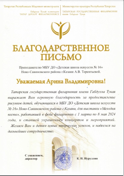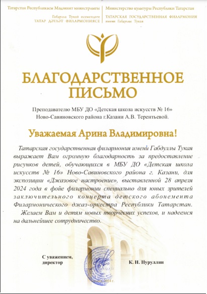 36.Терентьева А.В. - благ. письмо за предоставление рисунков в филармонию на тему "Джазовое настроение"