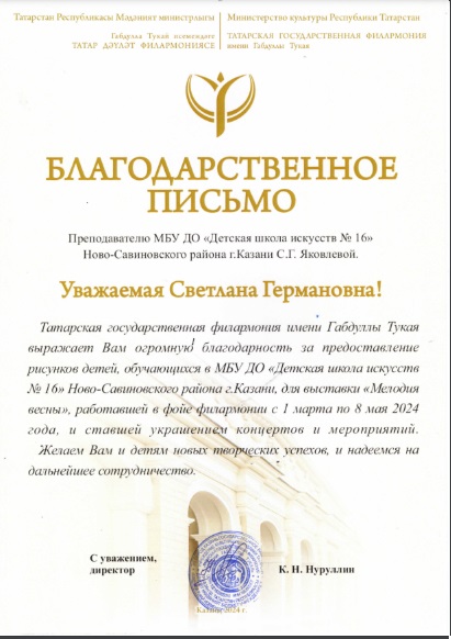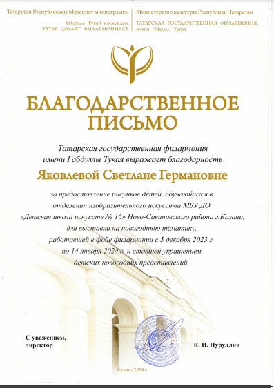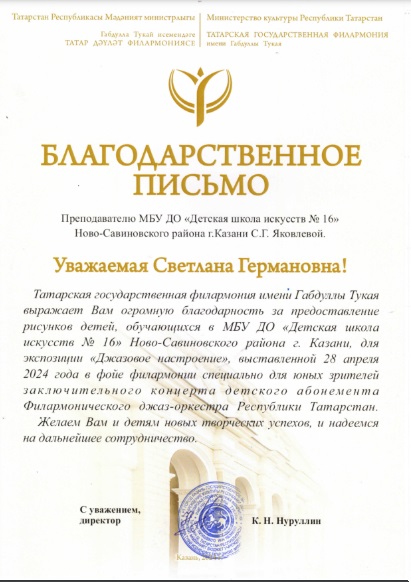 40. Яковлева С.Г. - благ. письмо за предоставление рисунков в филармонию на тему "Джазовое настроение"
