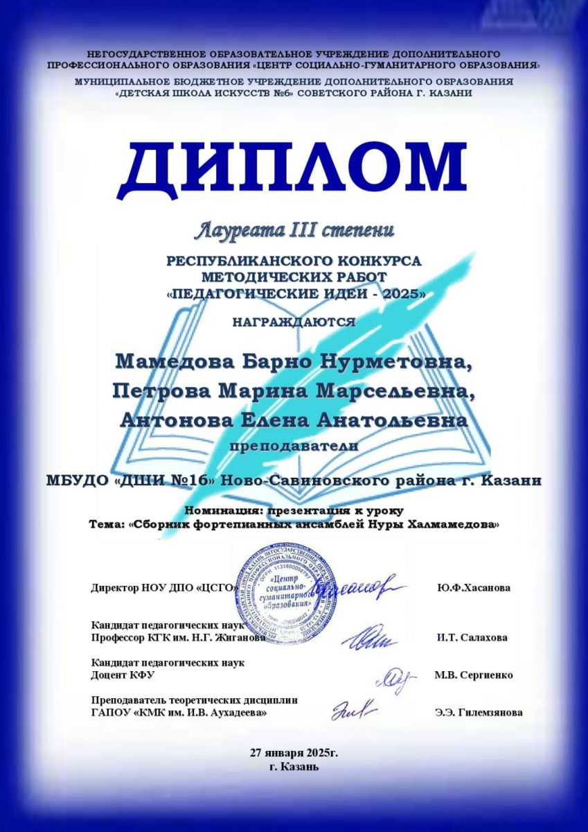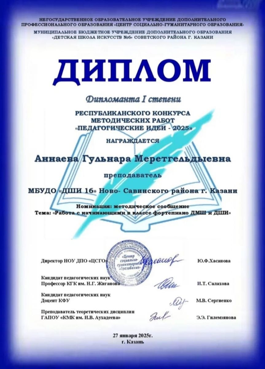 1. Аннаева Г.М. Диплом 1 степени. Республиканский конкурс методических работ "Педагогические идеи-2025"
