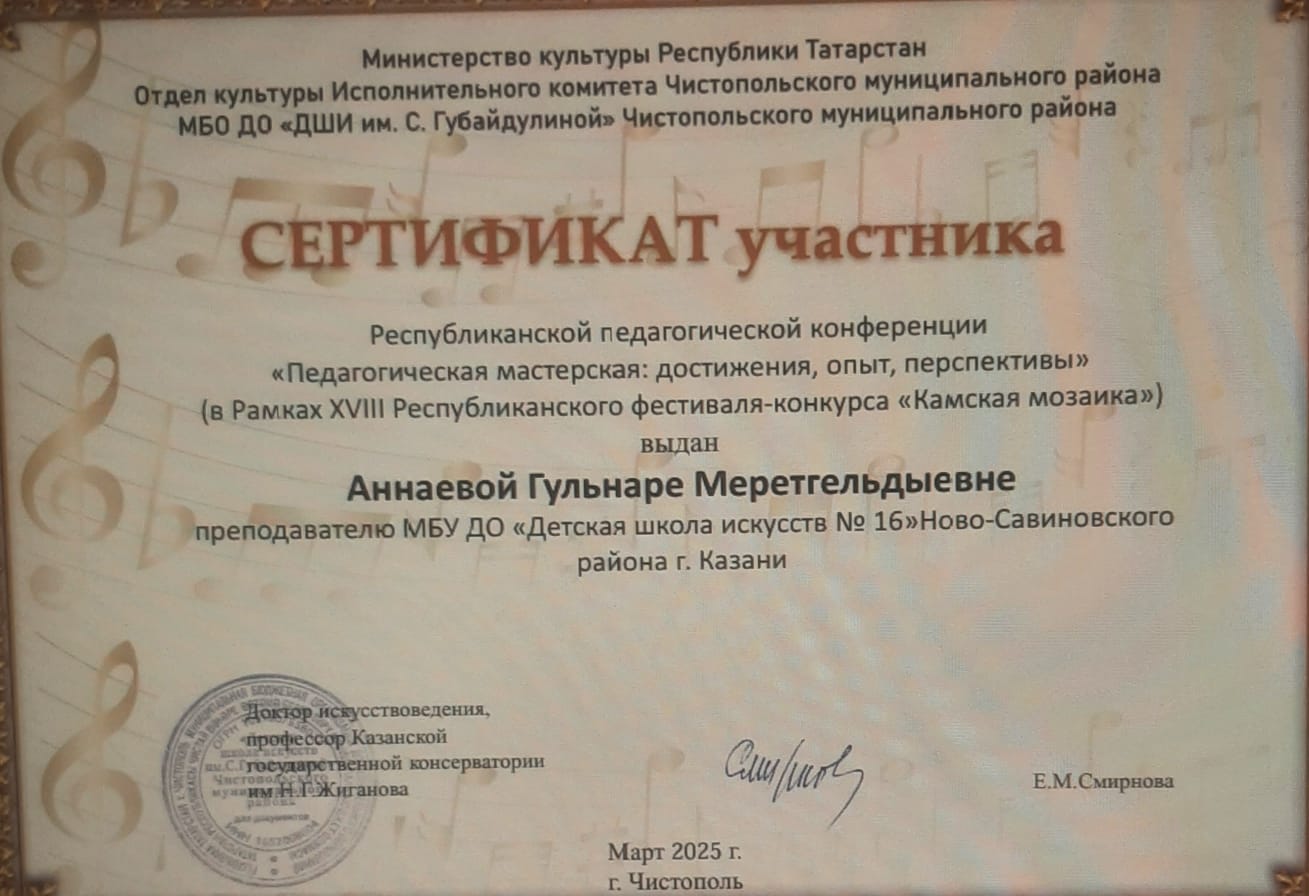 13. Аннаева Г.М. Лауреат 3 степени. Республиканский фестиваль-конкурс "Камская мозаика"