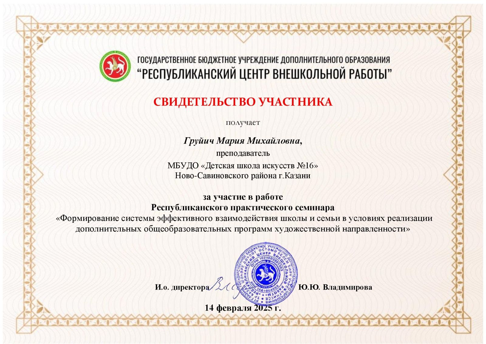 8. Груйич М.М.Республиканский практический семинар «Формирование системы эффективного взаимодействия школы и семьи в условиях реализации доп.общеобраз.программ худож.направленности», свидетельство участника