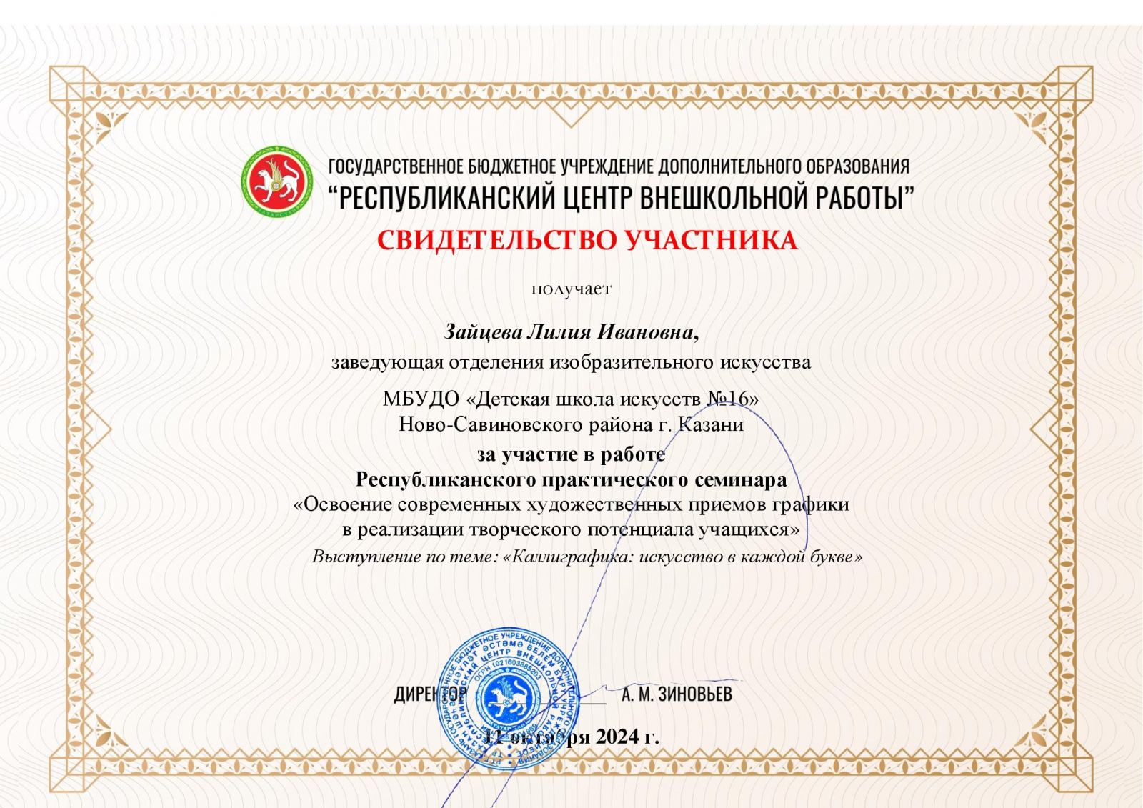 2. Зайцева Л.И. Республиканский практический семинар «Освоение современных худож.приемов графики в реализации творческого потенциала учащихся». Выступление по теме «Каллиграфика: искусство в каждой букве», свидетельство участника