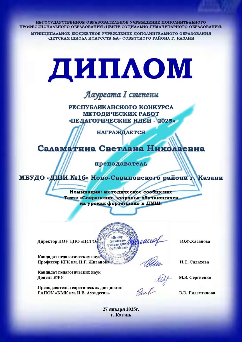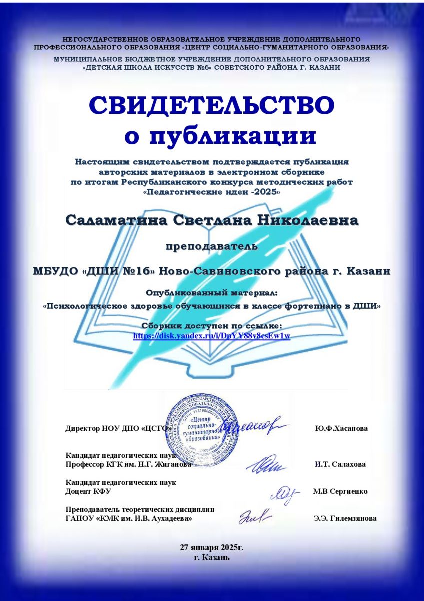 1. Саламатина С.Н. Свидетельство о публикации.Республиканский конкурс "Педагогические идеи-2025"