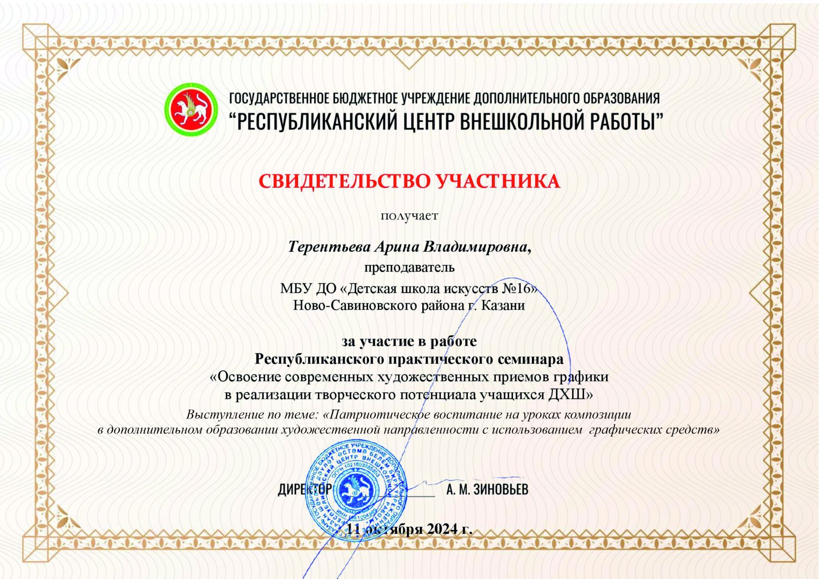 3. Терентьева А.В. Республиканский практический семинар «Освоение современных худож.приемов графики в реализации творческого потенциала учащихся». Выступление по теме «Патриотическое воспитание на уроках композиции в доп.оразовании художественной направленности с использованием графических средств», свидетельство участника