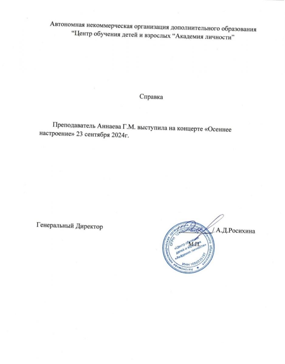 2. Аннаева Г.М. Выступление на концерте «Осеннее настроение». справка