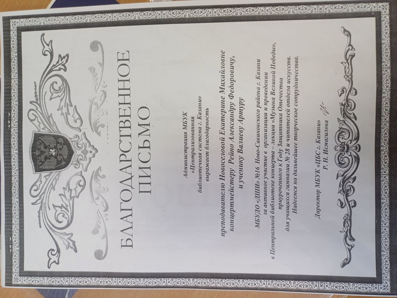37. Новоселова Е.М., Рейно А.Ф, ученик Валиев Артур. Благодарственное письмо за концерт в библиотеке