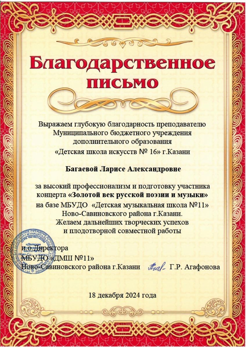 8. Багаева Л.А. Благодарственное письмо. Концерт "Золотой век русской поэзии и музыки"