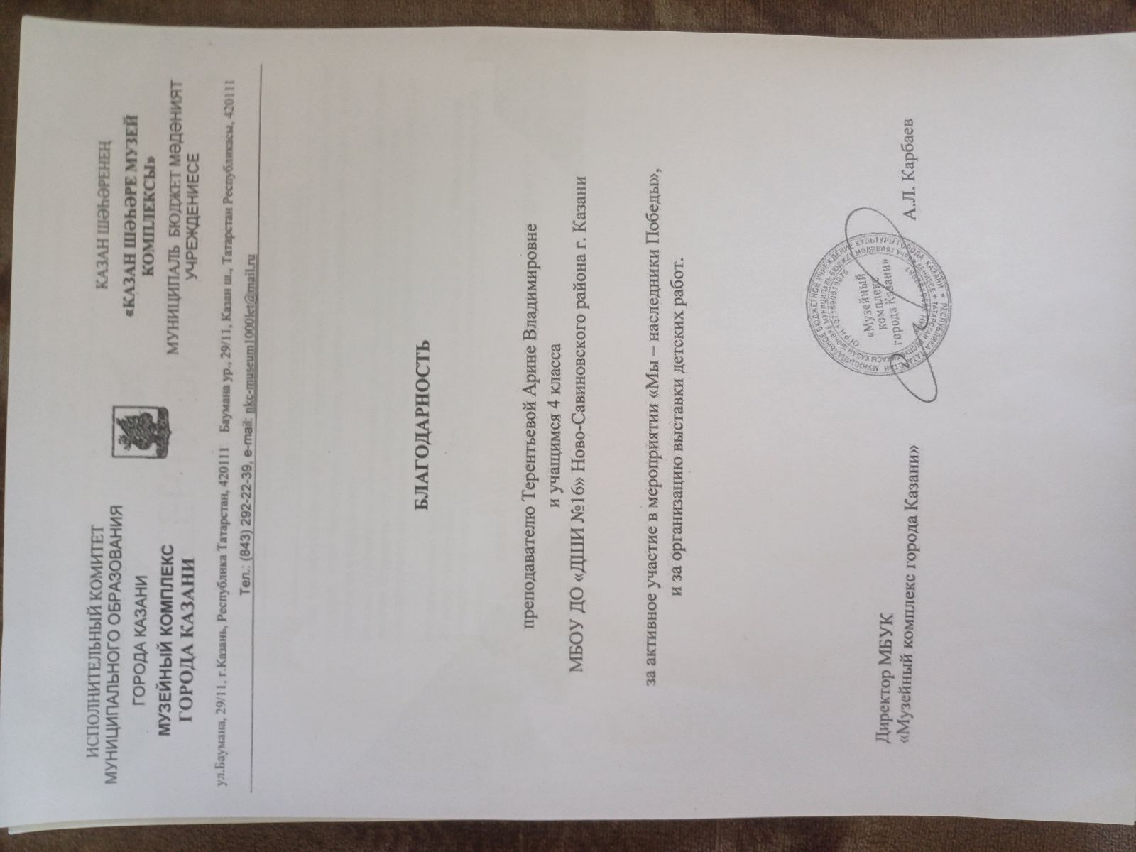 31. Терентьева А.В. Благодарность за выступление на открытии городской выставки "Лица Победы"