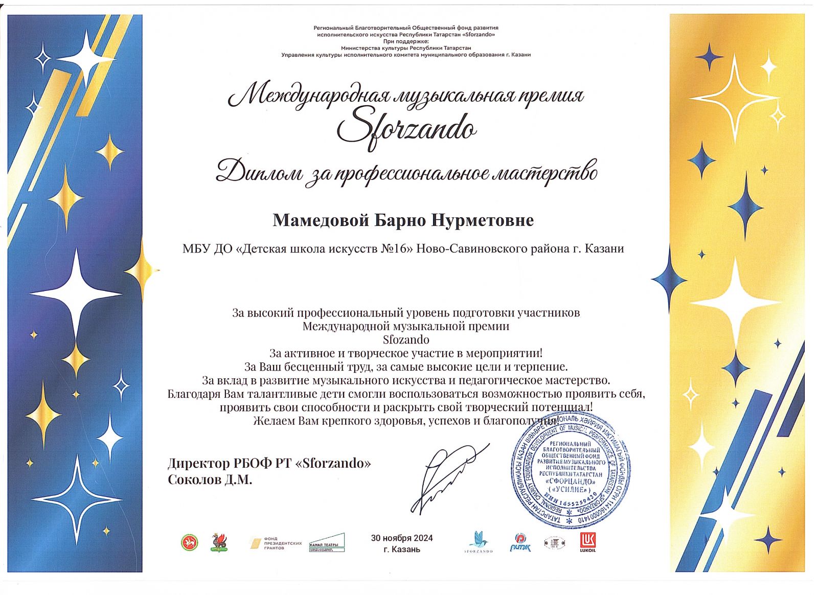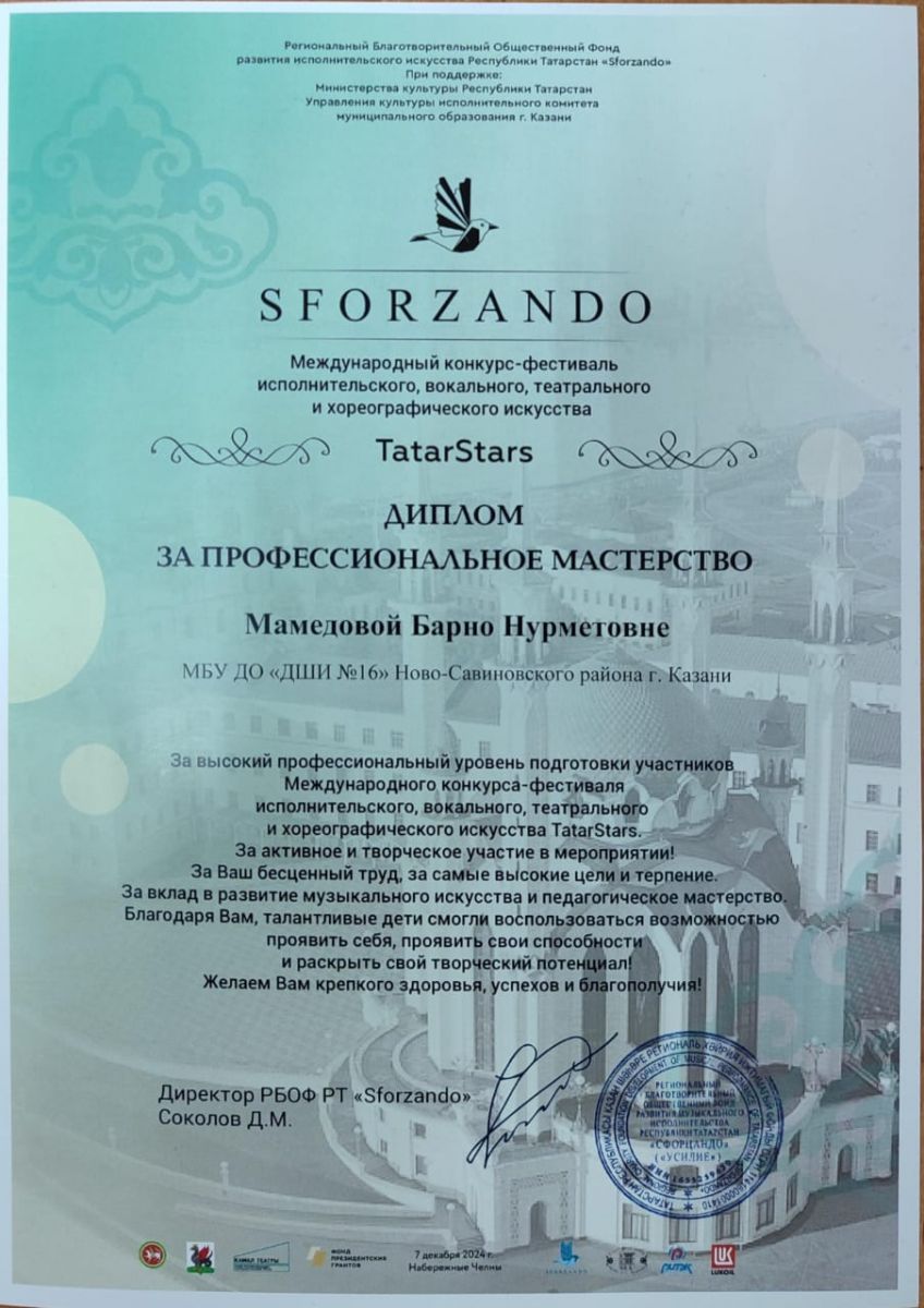 5. Мамедова Б.Н. Диплом «За профессиональное мастерство». Международный конкурс-фестиваль "Tatar stars"