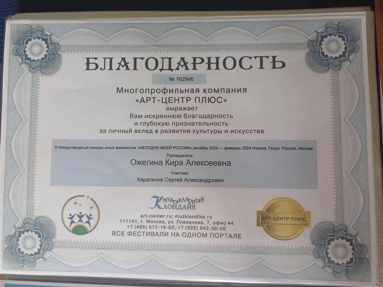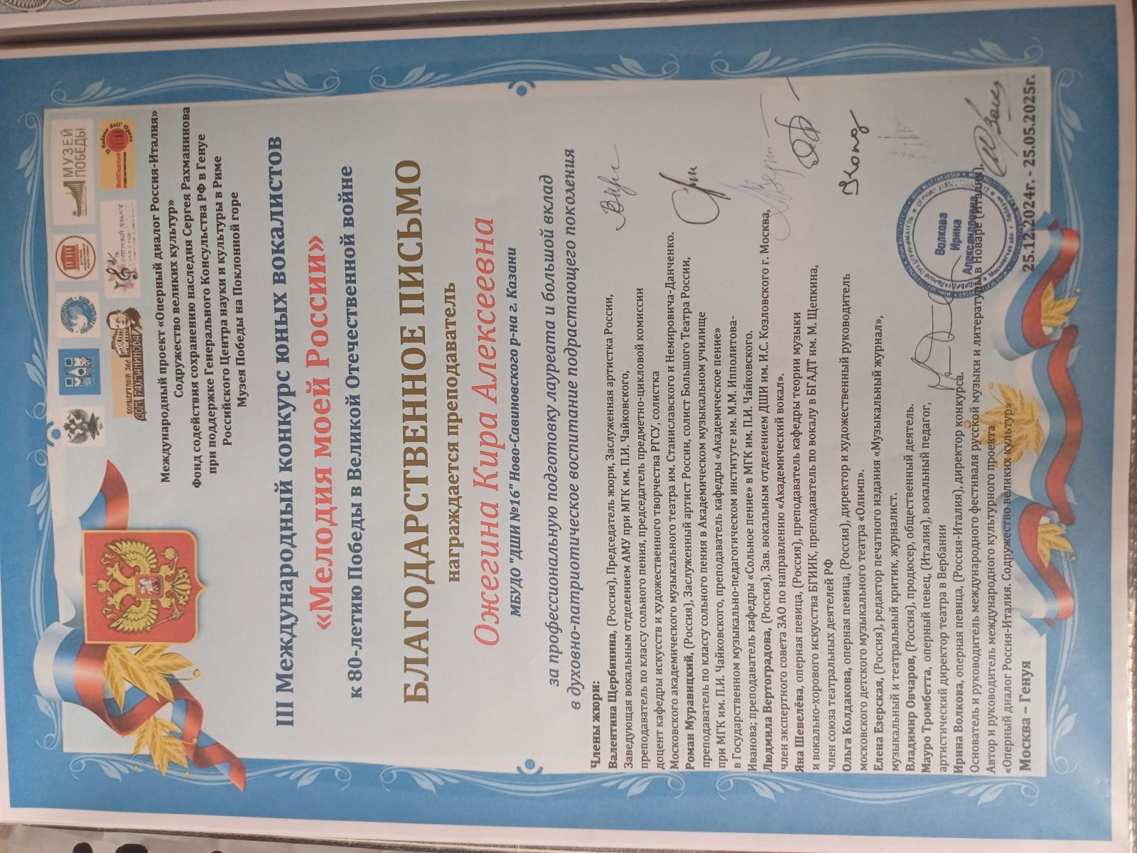 23. Ожегина К.А. Благодарность. Международный конкурс юных вокалистов "Мелодия моей России"