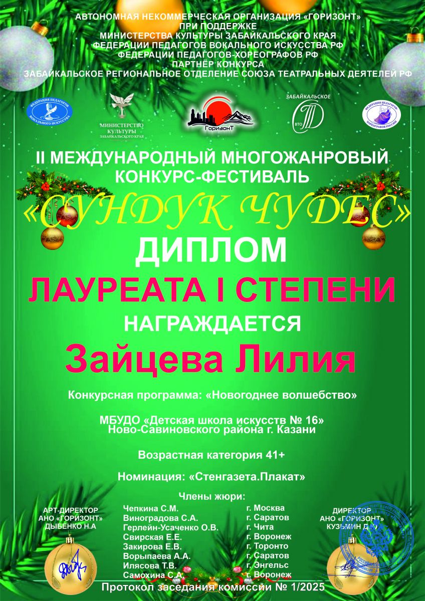 3. Зайцева Л.И. - лауреат 1 степени. Международный многожанровый конкурс-фестиваль «Сундук чудес»