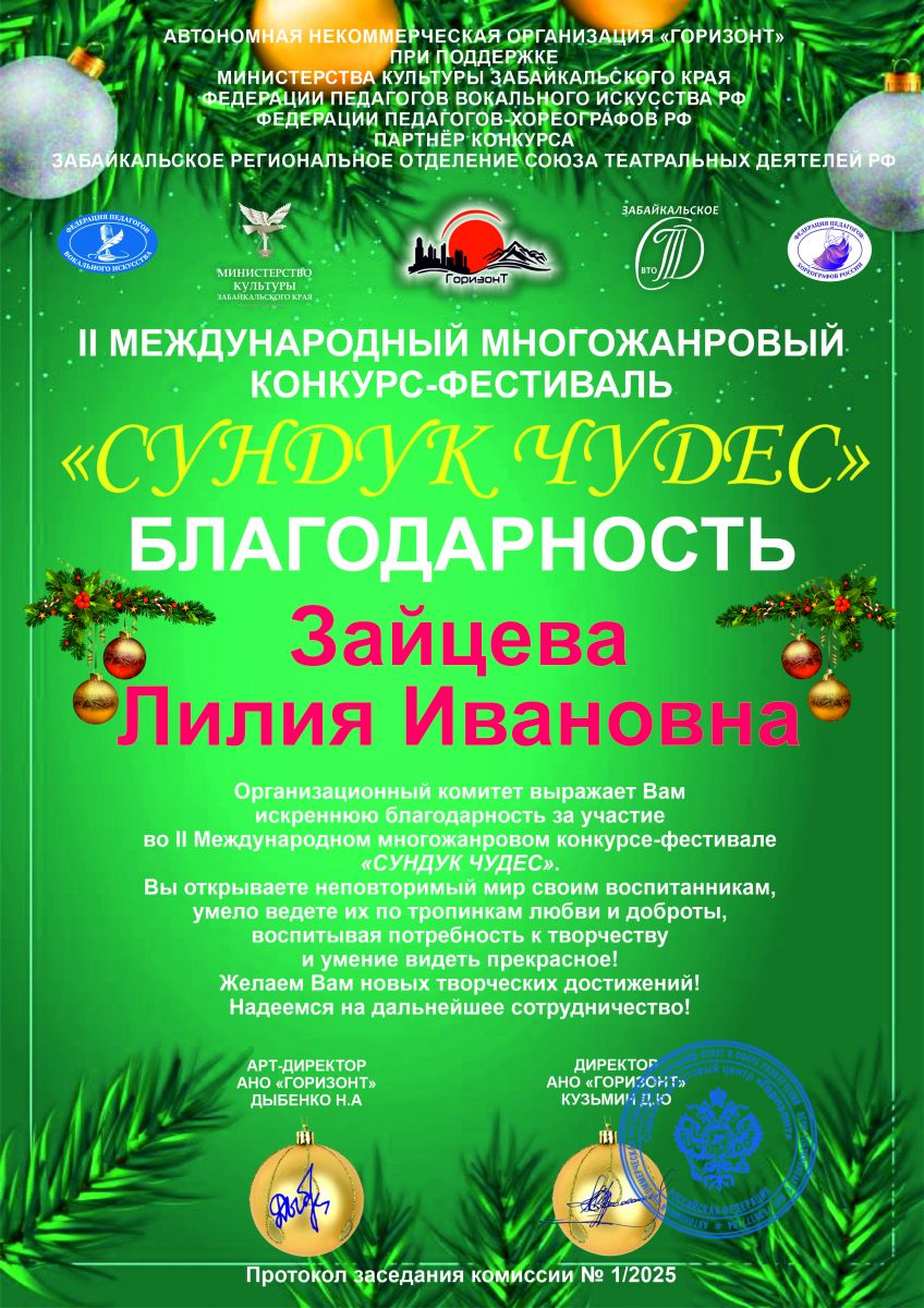 7. Зайцева Л.И. Благодарность. Международный многожанровый конкурс-фестиваль «Сундук чудес»