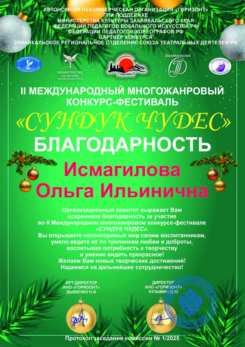 8. Исмагилова О.И. Благодарность. Международный многожанровый конкурс-фестиваль «Сундук чудес»