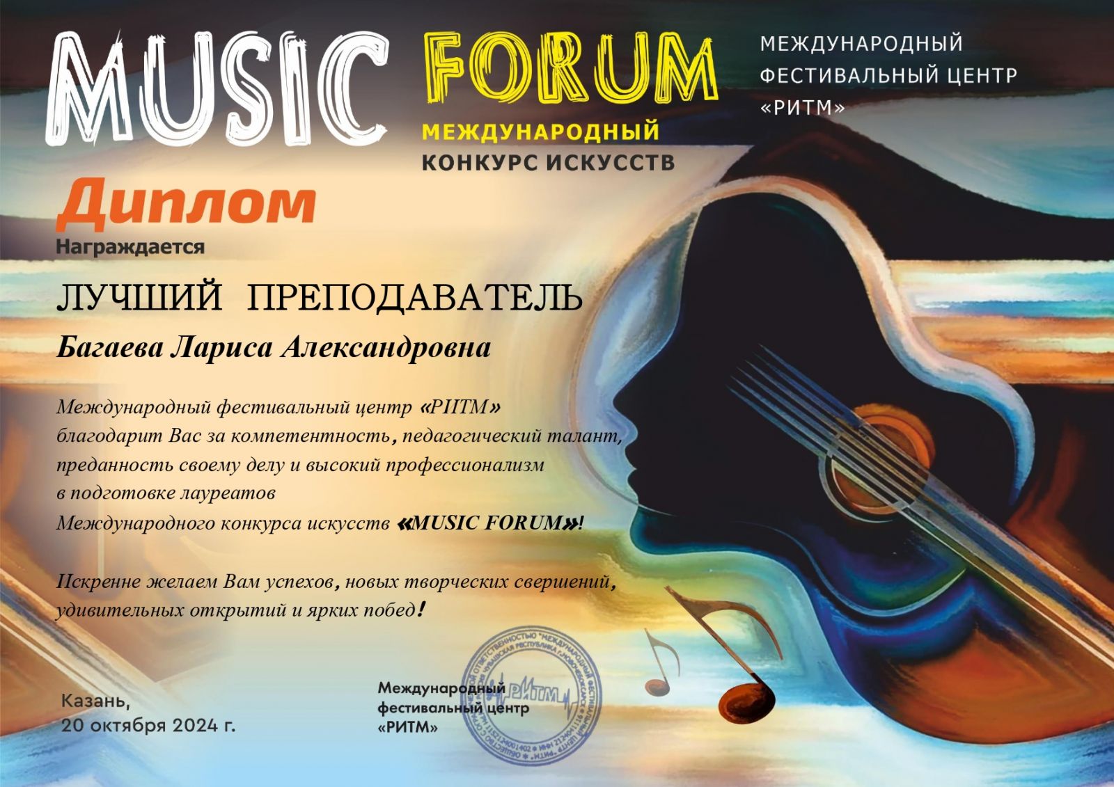 3. Багаева Л.А. Диплом "Лучший преподаватель". Международный конкурс искусств «В ритме времени»