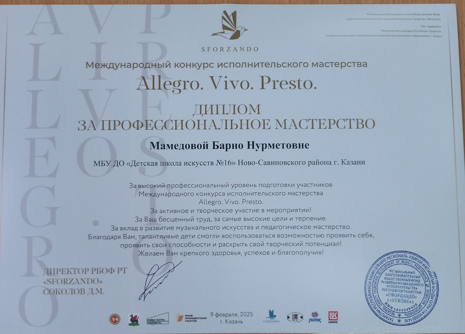 9. Асадуллина В.И. Диплом «За профессиональное мастерство». Международный конкурс исполнительского мастерства «Allegro.Vivo.Presto»
