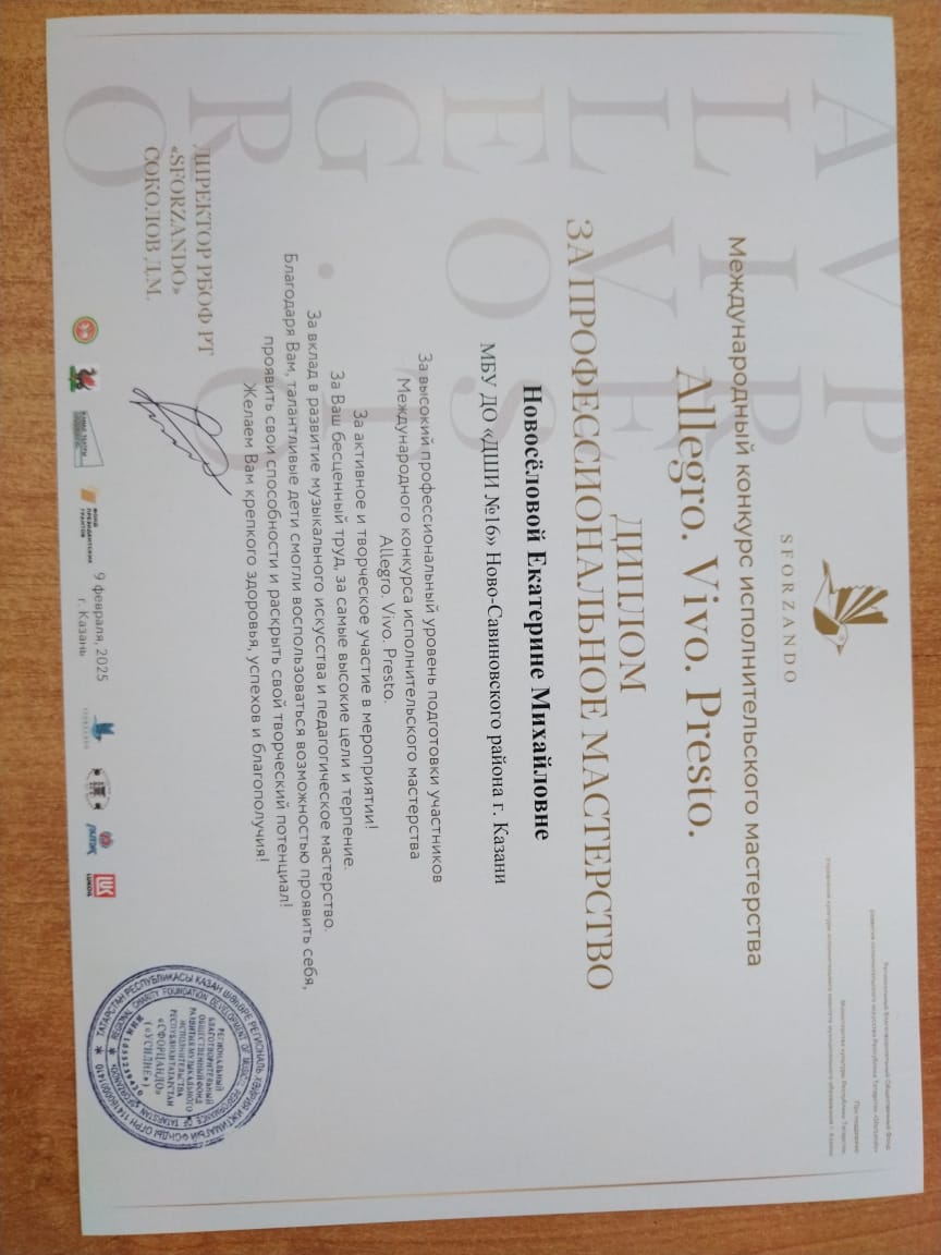 7. Новоселова Е.М. Диплом «За профессиональное мастерство». Международный конкурс исполнительского мастерства «Allegro.Vivo.Presto»