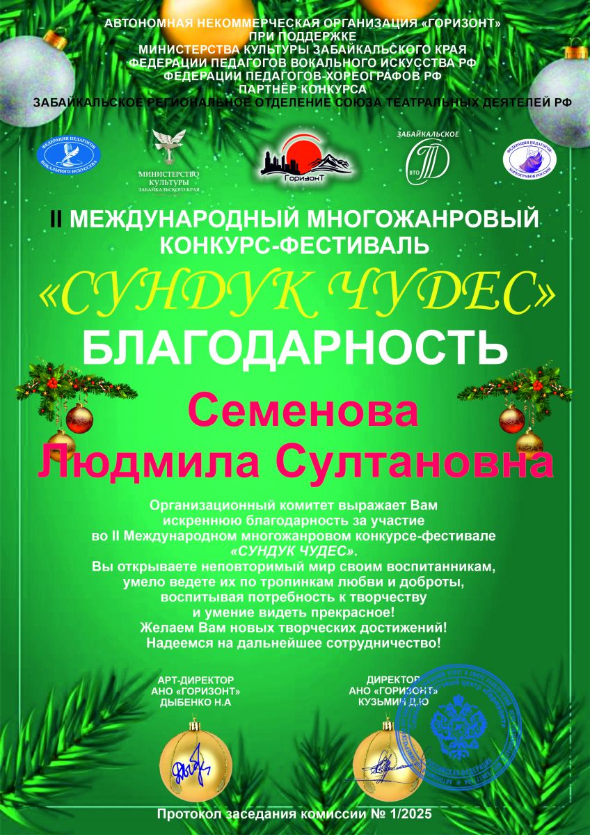 10. Семенова Л.С. Благодарность. Международный многожанровый конкурс-фестиваль «Сундук чудес»