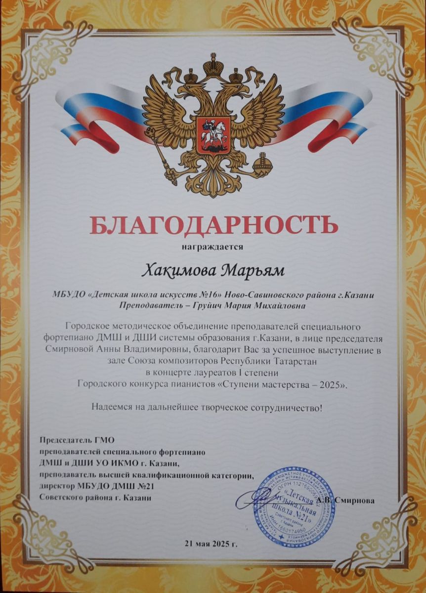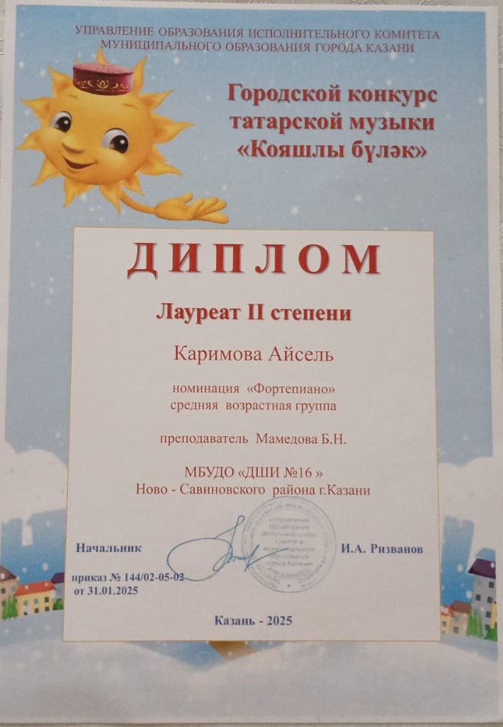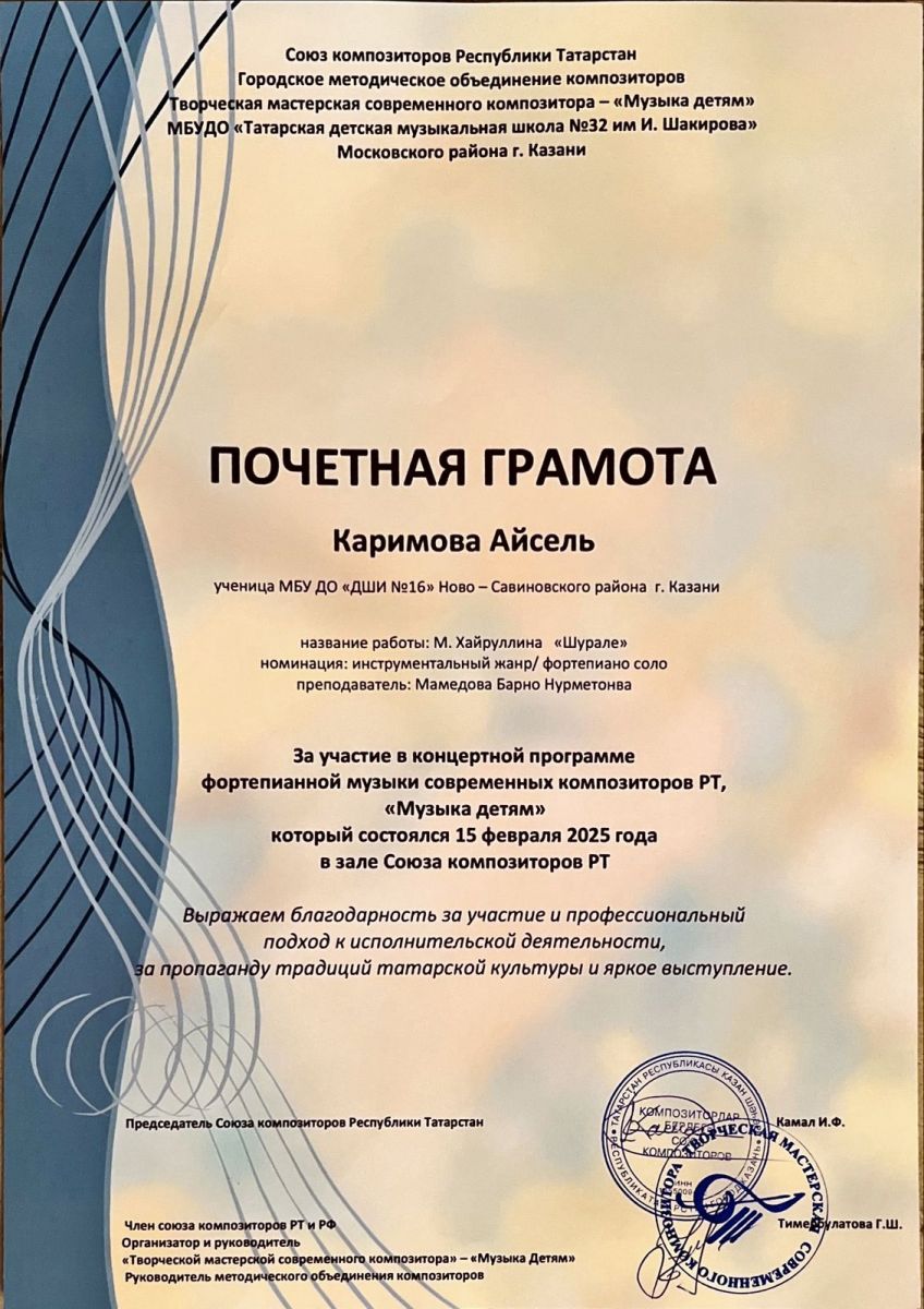 1. Каримова Айсель. Почетная грамота. Концерт фортеп.музыки современных композиторов РТ «Музыка детям»