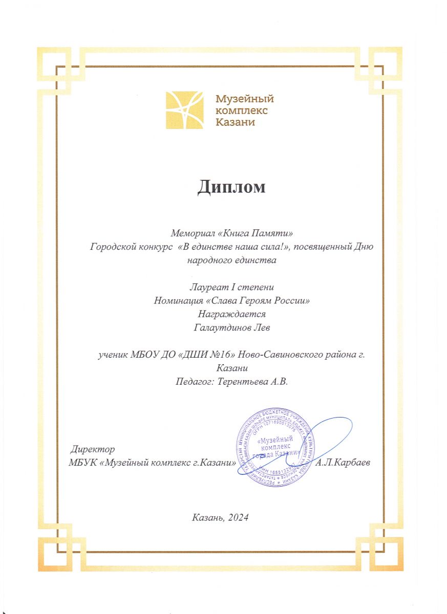 1. Галаутдинов Лев городской конкурс «В единстве наша сила!» - лауреат 1 степени